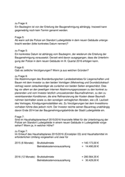 zu Frage 4: Ein Baubeginn ist von der Erteilung der Baugenehmigung abhängig. Insoweit kann gegenwärtig noch kein Termin genannt werden. Frage 5: Ab wann soll die Polizei am Standort Ludwigsfelde in dem neuen Gebäude unterge- bracht werden (bitte konkretes Datum nennen)? zu Frage 5: Ein konkretes Datum ist abhängig vom Baubeginn, der wiederum die Erteilung der Baugenehmigung voraussetzt. Derzeit wird davon ausgegangen, dass die Unterbrin- gung der Polizei in dem neuen Gebäude im III. Quartal 2016 erfolgen kann. Frage 6: Gab es zeitliche Verzögerungen? Wenn ja aus welchen Gründen? zu Frage 6: Die Abstimmungen des Brandenburgischen Landesbetriebes für Liegenschaften und Bauen mit dem Investor zu den beiden Verträgen (Mietvertrag und Grundstückskauf- vertrag) waren zeitaufwendiger als zunächst von beiden Seiten eingeschätzt. Dies lag vor allem an den jeweiligen internen Abstimmungsprozessen zu den konkret zu planenden und vom Investor letztlich umzusetzenden Baumaßnahmen, zu den zu vereinbarenden Konditionen, die eine Refinanzierung der Kosten dieser Baumaß- nahmen beinhalten sowie zu den sonstigen vertraglichen Abreden, wie z.B. Laufzeit des Vertrages, Kündigungsmodalitäten etc. Zu Verzögerungen bei dem Investitions- vorhaben führte dies jedoch nicht. Der Investor reichte seinen Bauantrag unabhängig davon Ende 2014 bei der Baugenehmigungsbehörde der Stadt Ludwigsfelde ein. Frage 7: Sind im Haushaltsplanentwurf 2015/2016 finanzielle Mittel für die Unterbringung der Polizei am Standort Ludwigsfelde in einem neuen Gebäude in Ludwigsfelde vorge- sehen? Wenn ja, in welcher Höhe? zu Frage 7: Im Entwurf des Haushaltsplanes 2015/2016 (Einzelplan 03) sind Haushaltsmittel im erforderlichen Umfang vorgesehen und zwar für 2015 (6 Monate): Bruttokaltmiete = 140.173,00 € Betriebskostenvorauszahlung = 14.490,00 € 2016 (12 Monate): Bruttokaltmiete = 280.564,35 € Betriebskostenvorauszahlung = 30.429,00 €