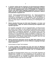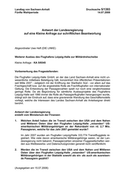 Landtag von Sachsen-Anhalt Drucksache 5/1393 Fünfte Wahlperiode 14.07.2008 Antwort der Landesregierung auf eine Kleine Anfrage zur schriftlichen Beantwortung Abgeordneter Uwe Heft (DIE LINKE) Weiterer Ausbau des Flughafens Leipzig-Halle zur Militärdrehscheibe Kleine Anfrage - KA 5/6545 Vorbemerkung des Fragestellenden: Die Flughafen Leipzig-Halle GmbH, an der das Land Sachsen-Anhalt eine nicht un- wesentliche mittelbare Beteiligung hält, konzentriert ihre öffentlichen Präsentationen seit Mitte 2007 - zeitgleich mit der Eröffnung der Startbahn Süd - vor allem auf das Frachtgeschäft bzw. auf die angestrebte Rolle als Frachtflughafen von internationaler Geltung. Die Entwicklung der Passagierzahlen spielt nur noch eine vergleichsweise geringe Rolle. Da als Begründung für sämtliche Ausbauprojekte des Flughafens Leipzig-Halle seit 1990 immer die Rolle als Passagierflughafen herangezogen wurde, drängt sich der Eindruck auf, dass eine gravierende Wandlung des Geschäftsmodells vorliegt, welche die lnteressen des Landes Sachsen-Anhalt als Anteilseigner direkt berührt. Antwort der Landesregierung erstellt vom Ministerium der Finanzen 1. Welchen Anteil haben die im Transit zwischen den USA und dem Nahen und Mittleren Osten über den Flughafen Leipzig-Halle „reisenden“ US- amerikanischen Militärangehörigen an der Rekordzahl von rd. 2,7 Mio. Passagieren, welche für das Jahr 2007 gemeldet wurde? Im Jahr 2007 wurden am Flughafen Leipzig/Halle 333.774 Transitfluggäste re- gistriert. Wie viele davon amerikanische Militärangehörige waren, ist der Lan- desregierung nicht bekannt. Passagierzahlen einzelner Fluggesellschaften wer- den aus Wettbewerbs- und Datenschutzgründen generell nicht veröffentlicht. 2. Werden die im Transit zwischen den USA und dem Nahen und Mittleren Osten über den Flughafen Leipzig-Halle „reisenden“ US-amerikanischen Militärangehörigen in der Statistik sowohl als ein- als auch als ausreisen- de Passagiere gezählt? (Ausgegeben am 15.07.2008)