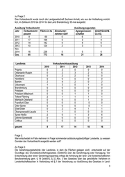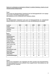 Namens der Landesregierung beantwortet der Minister für Ländliche Entwicklung, Umwelt und Land- wirtschaft die Kleine Anfrage wie folgt: Frage 1: Wie oft wurde das siedlungsrechtliche Vorkaufsrecht durch die Siedlungsgesellschaft in den vergange- nen fünf Jahren in Brandenburg rechtsgültig ausgeübt? (bitte tabellarisch pro Jahr und differenziert nach Landkreisen auflisten) Zu Frage 1: Das siedlungsrechtliche Vorkaufsrecht wurde durch die Siedlungsgesellschaft, die Landgesellschaft Sachsen-Anhalt mbH von 2010 bis November 2014 für das Land Brandenburg 65-mal ausgeübt. Landkreis 2010 2011 2012 2013 2014 Prignitz 0 2 0 0 0 Ostprignitz-Ruppin 0 2 3 2 5 Oberhavel 0 2 2 0 0 Havelland 0 0 0 0 0 Barnim 2 4 2 0 2 Uckermark 1 3 0 1 0 Stadt Brandenburg 0 0 0 0 0 Stadt Potsdam 0 0 0 0 0 Potsdam-Mittelmark 0 0 1 1 0 Teltow-Fläming 2 1 1 1 1 Märkisch-Oderland 0 0 0 1 0 Stadt Frankfurt /Oder 0 0 0 0 0 Oder- Spree 0 0 0 0 1 Elbe-Elster 0 2 4 1 1 Oberspreewald-Lausitz 1 1 0 0 0 Spree-Neiße 2 0 1 3 6 Dahme-Spreewald 0 0 0 0 0 Stadt Cottbus 0 0 0 0 0 Land Brandenburg ges. 8 17 14 10 16 Frage 2: Wie oft ist das Vorkaufsrecht in den vergangenen fünf Jahren zugunsten eines Einzelunternehmens, einer Personengesellschaft und einer juristischen Person ausgeübt worden? (bitte tabellarisch pro Jahr und differenziert nach Landkreisen auflisten)