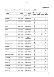346 AnlageXIX.4 Straftaten der Politisch motivierten Kriminalität -rechts-2007 [Alter zur Tatzeit] Abtsdorf 22.09.2007 § 86a StGB - - - - 0 0 0 0 Aken 16.05.2007 § 86a StGB 17 - - - 20 - - - 18 - - - 3 0 0 0 Aken 08.06.2007 § 86a StGB 21 - - - 1 0 0 0 Aken 01.07.2007 § 86a StGB 19 - - - 1 0 0 0 Aken 18.08.2007 § 86a StGB 29 - - - 1 0 0 0 Aken 25.08.2007 § 241 StGB - - 16 - 0 0 1 0 § 26 Aken 25.08.2007 VersammlG - - - - 0 0 0 0 Aken 25.08.2007 § 86a StGB - - - - 0 0 0 0 Alleringersleben 26.02.2007 § 86a StGB 18 - - - 1 0 0 0 Allstedt 10.02.2007 § 86a StGB - - - - 0 0 0 0 Allstedt 19.05.2007 § 86a StGB 25 - - - 1 0 0 0 Altenbrak 10.08.2007 § 86a StGB 37 - - - 1 0 0 0 Am Großen Bruch 14.04.2007 § 86a StGB 18 - - - 1 0 0 0 Annaburg 24.01.2007 § 86a StGB 18 - - - 1 0 0 0 Annaburg 27.02.2007 § 86a StGB 15 - - - 1 0 0 0 Annaburg 26.08.2007 § 86a StGB 28 - - - 1 0 0 0 Annaburg 09.11.2007 § 86a StGB - - - - 0 0 0 0 Annaburg 16.11.2007 § 86a StGB - - - - 0 0 0 0 Annaburg 19.11.2007 § 86a StGB 18 - - - 1