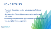 HOME AFFAIRS • Thematic discussions on the future course of internal security • Strengthening EU's resilience to terrorism and violent extremism • Promoting comprehensive approach to managing migration • Improving border management
