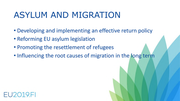 ASYLUM AND MIGRATION • Developing and implementing an effective return policy • Reforming EU asylum legislation • Promoting the resettlement of refugees • Influencing the root causes of migration in the long term