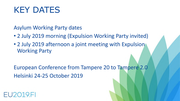 KEY DATES Asylum Working Party dates • 2 July 2019 morning (Expulsion Working Party invited) • 2 July 2019 afternoon a joint meeting with Expulsion Working Party European Conference from Tampere 20 to Tampere 2.0 Helsinki 24-25 October 2019