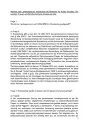 Namens der Landesregierung beantwortet die Ministerin für Arbeit, Soziales, Ge- sundheit, Frauen und Familie die Kleine Anfrage wie folgt: Frage 1: Wie ist das Landesgremium nach § 90a SGB V in Brandenburg aufgestellt? zu Frage 1: In Brandenburg gibt es seit dem 12. März 2014 das gemeinsame Landesgremium nach § 90a SGB V. Das Gesundheitsministerium, die Kassenärztliche Vereinigung Brandenburg, die Landesverbände der Krankenkassen sowie die Ersatzkassen, die Landeskrankenhausgesellschaft Brandenburg und die kommunalen Spitzenverbände in Brandenburg werden in diesem Gremium gemeinsam mit den in Brandenburg für die Wahrnehmung der Interessen von Patientinnen und Patienten und der Selbsthilfe chronisch kranker und behinderter Menschen maßgeblichen Organisationen im Sin- ne des § 140f SGB V, der Landesärztekammer Brandenburg, der Ostdeutschen Psy- chotherapeutenkammer und der auf Landesebene für die Wahrnehmung der Interes- sen der Pflegeberufe maßgebliche Dachorganisation Fragen der sektorenübergrei- fenden flächendeckenden medizinischen Versorgung behandeln. Regionale Versor- gungsbedürfnisse, raumplanerische Aspekte und Perspektiven der demografischen Entwicklung werden dabei Berücksichtigung finden. Rechtsgrundlage hierfür ist das am 15. Oktober 2013 vom Landtag Brandenburg be- schlossene Gesetz zur Errichtung eines gemeinsamen Landesgremiums im Sinne des § 90a des Fünften Buches Sozialgesetzbuch (SGB V gemeinsames Landesgre- miumsgesetz - SGB V gLG). Das gemeinsame Landesgremium hat sich mit einer Geschäftsordnung auf die Grundlagen der Zusammenarbeit verständigt und mit sei- nem ersten Beschluss zu einer Arbeitsplanung die Grundlagen eines gemeinsamen Verständnisses seiner Aufgaben vor dem Hintergrund des bundes- und landesrecht- lichen Rahmens beschrieben. Frage 2: Welche Ziele werden in diesem Jahr mit diesem Instrument verfolgt? zu Frage 2: In der konstituierenden Sitzung des gemeinsamen Landesgremiums ist der Be- schluss gefasst worden, abgestimmte Empfehlungen zu sektorenübergreifenden Fragen zu entwickeln. Dazu ist ein Arbeitsausschuss gebildet worden, um in einem ersten Schritt Regionen / Standorte zu identifizieren, in denen eine arbeitsteilige Ver- netzung von ambulanter und stationärer Versorgung besonders geeignet scheint. Darüber hinaus sollten auch konkrete Innovationsskizzen erarbeitet und zugleich et- waige rechtliche Umsetzungshindernisse benannt werden. Die Mitglieder des Ar- beitsausschusses sprachen sich einhellig dafür aus, zur Vorbereitung der dem ge-