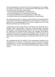 Die Gesundheitspolitik des Landes ist seit vielen Jahren geprägt durch den engagier- ten Einsatz für Verbesserungen der bundesrechtlichen Rahmensetzungen mit Blick auf die medizinische Versorgung, etwa bezüglich - innovativer sektorenübergreifender Versorgungsformen, - der Rahmenbedingungen für die Ausübung des Arztberufes, - der Verankerung Medizinischer Versorgungszentren im SGB V oder - der Weiterentwicklung der berufsgruppenübergreifenden Zusammenarbeit. Die Landesregierung hat sich in intensiver Zusammenarbeit mit der Kassenärztlichen Vereinigung für eine Reform der Bedarfsplanung in der ambulanten Versorgung ein- gesetzt. Was der Bundesgesetzgeber 2012 und 2013 umgesetzt hat, war im Land Brandenburg teilweise schon jahrelange Praxis. In Brandenburg herrscht ein gutes Klima für Innovationen in der Versorgung. Die zu- ständigen Partner (Kassenärztliche Vereinigung, Krankenhausträger, Gesetzliche Krankenkassen, Landesärztekammer) beweisen das durch ihre bundesweit beachte- ten Projekte wie das Telemedizinprojekt Fontane, das Preisträger des Bundesfor- schungsministeriums geworden ist oder die Fallmanagerin AGNS zwei sowie die am Krankenhaus verortete „KV RegioMed-Bereitschaftsdienstpraxis“ der Partner in der IGIB (Innovative Gesundheitsversorgung in Brandenburg: KVBB, AOK NO und Bar- mer). Die Landesregierung setzt sich weiterhin für eine angemessene Vergütung für die Vertragsärztinnen und -ärzte ein. In diesem Sinne macht sie im aktuellen Gesetzge- bungsverfahren für ein GKV-Versorgungsstärkungsgesetz gemeinsam mit anderen betroffenen Ländern deutlich, dass strukturelle Benachteiligungen abgebaut werden müssen.
