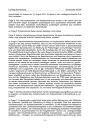 Landtag Brandenburg Drucksache 6/7356 6. Wahlperiode Antwort der Landesregierung auf die Kleine Anfrage Nr. 2906 der Abgeordneten Andrea Johlige (Fraktion DIE LINKE) Drucksache 6/7090 Suizide und Suizidversuche von Asylsuchenden in Brandenburg 2010 bis 2017 Namens der Landesregierung beantwortet die Ministerin für Arbeit, Soziales, Gesundheit, Frauen und Familie die Kleine Anfrage wie folgt: Vorbemerkung der Fragestellerin: Geflüchtete sind vielfältigen psychischen Belastungen durch die Fluchterfahrungen aber bspw. auch durch die Unsicherheit im Asylverfahren, mangelnde Lebensperspektiven, die Unterbringungssituation oder drohende Abschiebun- gen ausgesetzt. Solche starken Belastungen können zum Wunsch, das eigene Leben zu beenden, führen. Frage 1: Wie viele Suizide und Suizidversuche von Asylsuchenden bzw. abgelehnten Asylbewerberinnen und Asylbewerbern in den Jahren 2010 bis 2017 sind der Landesregie- rung bekannt? (Bitte die einzelnen Fälle aufschlüsseln nach Datum, Ort, Unterbringungs- einrichtung, Herkunftsland, Alter und Geschlecht! Bitte Fälle in den Erstaufnahmeeinrich- tungen des Landes getrennt aufführen!) Frage 2: Sind der Landesregierung die Umstände der einzelnen Fälle bekannt? Wenn ja, bitte jeweils kurz ausführen! Frage 3: Sind der Landesregierung die Motive bzw. Auslöser für die Suizide bzw. Suizid- versuche der jeweiligen Asylbewerberinnen und Asylbewerber bekannt? Wenn ja, bitte jeweils kurz ausführen! Frage 4: Welche der Suizide oder Suizidversuche stehen in einem engen zeitlichen Zu- sammenhang mit ablehnenden Bescheiden des Bundesamts für Migration und Flüchtlinge bzw. Abschiebeanordnungen oder Abschiebeversuchen und könnten somit der Auslöser gewesen sein? zu Fragen 1 bis 4: Die Fragen 1 bis 4 werden aufgrund des Sachzusammenhangs ge- meinsam beantwortet. Es wird keine amtliche Statistik über Suizide und Suizidversuche von Asylsuchenden bzw. abgelehnten Asylbewerberinnen und Asylbewerbern geführt. Auch die Zentrale Ausländerbehörde (ZABH) des Landes Brandenburg führt keine Statistik über Suizide oder Suizidversuche in der Erstaufnahmeeinrichtung (EAE) des Landes Brandenburg. Zudem steht bei Selbstverletzungen oft nicht eindeutig fest, ob tatsächlich eine Selbsttötungsabsicht bestand. Aus dem Jahr 2013 ist ein Suizid in der EAE bekannt. Hierzu wird auf die Beantwortung der Fragen 1332 und 1333 in der Fragestunde der 78. Sitzung des Landtages Brandenburg am 6. Juni 2013 sowie auf TOP 9 der 44. Sitzung des Eingegangen: 08.09.2017 / Ausgegeben: 13.09.2017
