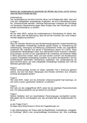 Landtag Brandenburg Drucksache 6/3191 6. Wahlperiode Antwort der Landesregierung auf die Kleine Anfrage 1267 der Abgeordneten Birgit Bessin, Thomas Jung und Steffen Königer der AfD-Fraktion Drucksache 6/2982 Einschleusung krimineller Minderjähriger Wortlaut der Kleinen Anfrage 1267 vom 13.11.2015: Das Hamburger Abendblatt vom 27.11.2014 berichtet schon vor fast einem Jahr über die bewusste Einschleusung schwerkrimineller Flüchtlinge, die Deutschland nur zu dem Zweck aufsuchen, um hier Straftaten zu begehen. Hierbei soll es sich haupt- sächlich um minderjährige, unbegleitete Flüchtlinge handeln, die sich nicht bei den Behörden gemeldet haben. Wir fragen die Landesregierung: 1.Mit wie vielen MUFL rechnet die Landesregierung in Brandenburg für dieses Jahr, bei wie vielen steht die Befürchtung, dass sie sich der Kontrolle, bzw. einer ent- sprechenden Begleitung entziehen? 2.Welche Schleuserwege konnten für diesen speziellen Fall in Erfahrung gebracht werden, wie kann bei dieser Tätergruppe eine Einreise verhindert, bzw. wirksame Kontrolle sichergestellt werden? 3.Wie viele MUFL haben erst bei drohender Untersuchungshaft Asyl beantragt, um sich somit in einem „gesicherten Verfahren“ zu befinden? 4.Wie viele von den aufgegriffenen MUFL waren bei der jeweiligen Personenkontrol- le bzw. Verhaftung bewaffnet und auf welche Art und Weise? 5.Welche Straftaten sind von beschriebener Personengruppe durchgeführt worden. Bitte geben Sie Art und Häufigkeit, bzw. das vermutete Alter der entsprechenden Täter an.