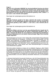 3 teln aufmerksam zu machen, sind grundlegende Ziele schulischer Gesundheitsförde- rung. Alle Informationen zu aktuellen gesundheitspolitischen Themen werden den für Ge- sundheitsförderung zuständigen schulfachlichen Referentinnen und Referenten des Landesverwaltungsamtes zur Verfügung gestellt, um eine weite Streuung von Infor- mationsmaterial an den Schulen zu ermöglichen. Des Weiteren erfolgen Veröffentli- chungen und Hinweise auf dem Landesbildungsserver oder im Schulverwaltungsblatt des Landes Sachsen-Anhalt. Eine Internetpräsentation auf dem Landesbildungsser- ver zur schulischen Gesundheitsförderung soll zum Schuljahresbeginn 2007/08 fertig gestellt werden. Rund 100 Schulen haben inzwischen ein besonderes Profil als gesundheitsfördernde Schulen entwickelt. An diesen Schulen wird auch einer gesunden Ernährung beson- dere Bedeutung zugemessen. Das Netzwerk gesundheitsfördernder Schulen wird seit 1995 durch das Regionale Unterstützungszentrum der LVG (RUZ) betreut. Ins- gesamt kooperiert das RUZ mit rd. 400 Schulen des Landes in verschiedenen Berei- chen schulischer Gesundheitsförderung. Immer mehr gesundheitsfördernde Schulen im Land stellen sich den strengen Krite- rien der Landesvereinigung für Gesundheit Sachsen-Anhalt e. V. und nehmen am Audit „Gesunde Schule“ teil. Das Audit Gesunde Schule hat sowohl gesundheits- als auch bildungspolitische Relevanz. In sechs Kategorien, die durch insgesamt 60 Krite- rien untersetzt sind, wird die Qualität schulischer Gesundheitsförderung im Kontext schulischer Qualitätsentwicklung insgesamt hinterfragt. Gegenwärtig findet durch die HS Anhalt (FH) im Rahmen einer Diplomarbeit an 100 Schulen des Landes eine Erhebung zur Mittagsversorgung statt. Da es bisher keine umfassende Analyse zur Mittagsversorgung in Sachsen-Anhalt gibt, wird das Kultusministerium die Ergebnisse der Befragung, die im Herbst 2007 vorliegen wer- den, umfassend auswerten. Die Ergebnisse sollen zugleich genutzt werden, um ei- nen praxisorientierten Leitfaden für gesunde Schulverpflegung zu entwickeln. Frage 7: Existieren Systeme zur Qualitätssicherung der Schulspeisung und wie beurteilt die Landesregierung ihre Wirksamkeit? Dazu liegen der Landesregierung keine Informationen vor.