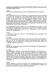 Landtag Brandenburg Drucksache 6/2781 6. Wahlperiode Antwort der Landesregierung auf die Kleine Anfrage 1101 der Abgeordneten Dierk Homeyer und Gordon Hoffmann der CDU-Fraktion Drucksache 6/2563 Nichtumsetzung der Schulplicht für Flüchtlingskinder in Fürstenwalde/Spree Wortlaut der Kleinen Anfrage 1101 vom 14.09.2015: Kinder von Flüchtlingen sind schulpflichtig, sobald sie die Erstaufnahmeeinrichtungen verlassen. Tatsächlich ist die Schulpflicht eine wichtige Voraussetzung für die In- tegration von Flüchtlingen in unsere Gesellschaft. Offenbar wird die Schulpflicht aber nicht immer durchgesetzt. So liegt uns folgender Fall vor: Der Sohn eines Asylbewerbers, der in wenigen Wochen acht Jahre alt wird, ist kürzlich allein dank des Einsatzes eines engagierten Anwohners einer Schule zu- gewiesen worden. Zuvor waren Vater und Sohn für einige Monate in Fürstenwal- de/Spree untergebracht, ohne dass der Sohn zur Schule ging. Beide halten sich deutlich länger als sechs Monate in Deutschland auf. Aufgrund ihres Herkunftslandes besteht die berechtigte Hoffnung, dass ihr Antrag auf Asyl positiv beschieden wird. Wir fragen die Landesregierung: 1. Warum war ein Schulbesuch des Jungen in Fürstenwalde /Spree nicht möglich? 2. In wie vielen Fällen kann aktuell im Land Brandenburg die Schulpflicht nicht durchgesetzt werden? 3. Wie plant die Landesregierung die Einhaltung der Schulpflicht für Flüchtlingskinder in Zukunft sicherzustellen? 4. Welche Behörde ist nach dem Verlassen der Erstaufnahmeeinrichtung für die Erfassung der Flüchtlinge und die Verteilung im Land Brandenburg zuständig, und wie wird die Schulaufsicht in diesen Prozess eingebunden? 5. Auf welchem Wege werden Schulen über Flüchtlingskinder, die bei ihnen zu beschulen sind, informiert? Welche schulorganisatorischen und welche pädagogischen Hilfe können Schulen mit Flüchtlingskinder in Anspruch nehmen?