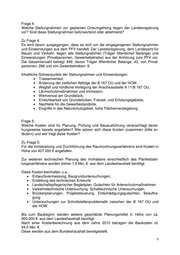 Frage 4: Welche Stellungnahmen zur geplanten Ortsumgehung liegen der Landesregierung vor? Sind diese Stellungnahmen befürwortend oder ablehnend? Zu Frage 4: Es wird davon ausgegangen, dass es sich um die eingegangenen Stellungnahmen und Einwendungen aus dem PFV handelt. Der Landesregierung, dem Landesamt für Bauen und Verkehr, liegen alle Stellungnahmen (Träger öffentlicher Belange) und Einwendungen (Privatpersonen, Gewerbebetriebe) aus der Anhörung zum PFV vor. Die Gesamtanzahl beträgt 449, davon Träger öffentlicher Belange: 43, von Privat- personen: 398 und von Gewerbetrieben: 8. Inhaltliche Schwerpunkte der Stellungnahmen und Einwendungen: Trassenverlauf, Änderung der zeitlichen Abfolge der B 167 OU und der HOW, Wegfall und nördliche Verlegung der Anschlussstelle A 11/B 167 OU, Lärmschutzmaßnahmen und Immission, Wertverlust am Grundstück, Erreichbarkeit von Grundstücken, Freizeit- und Erholungsgebiete, Nachteile für die Gewerbestandorte, Eingriffe in das Naturschutzgebiet, hohe Flächenversiegelung. Frage 5: Welche Kosten sind für Planung, Prüfung und Bauausführung veranschlagt bezie- hungsweise bereits angefallen? Wie setzen sich diese Kosten zusammen (bitte er- läutern) und wer trägt diese Kosten? Zu Frage 5: Für die Vorbereitung und Durchführung des Raumordnungsverfahrens sind Kosten in Höhe von 407.000 € angefallen. Zur weiteren technischen Planung des Vorhabens einschließlich des Planfeststel- lungsverfahrens wurden bisher 1,9 Mio. €. aus dem Landeshaushalt benötigt. Diese Kosten beinhalten u.a.: Entwurfsvermessung, Baugrunduntersuchungen, Erstellung des technischen Entwurfs Landschaftspflegerischer Begleitplan, Gutachten für Artenschutzmaßnahmen Verkehrstechnische Untersuchung, Schalltechnische Untersuchungen Brückenplanungen, Projektsteuerung, Entschädigungsgutachten, Beauftra- gung Untersuchungen zur Schnittstellenproblematik zwischen der B 167 OU und der HOW. Bis zum Baubeginn werden weitere geschätzte Planungsmittel in Höhe von ca. 900.000 €. aus dem Landeshaushalt benötigt. Nach einer Kostenberechnung aus dem Jahre 2010 betragen die Baukosten rd. 54,0 Mio. €. Diese werden aus dem Bundeshaushalt bereitgestellt.