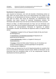 Auftraggeber: Ministerium für Infrastruktur und Landesplanung des Landes Brandenburg (MIL) Auftragnehmer: RegioKontext (projektteam_buendnis@regiokontext.de) Bezahlbarkeit im Eigentumssegment Jeder Haushalt hat Wohnkosten, doch nicht alle Haushalte in Brandenburg wohnen zur Miete. Daher soll versucht werden auch für den Eigentumsbereich klare Kriterien für die Gefährdung von der Bezahlbarkeit des Wohnens zu definieren. Der grundsätzliche Ansatz bleibt dabei der gleiche: Nach Abzug der Wohnkosten vom Nettoeinkommen eines Haushaltes muss diesem Haushalt ein bestimmter Mindestbetrag verbleiben. Die Wohnkosten sollen darüber hinaus nicht mehr als ein Drittel des Einkommens ausmachen. Während bei Mieter- und Mieterinnenhaushalte die Frage nach den Wohnkosten recht einfach mit einem Blick auf die monatlichen Überweisungen an den Vermieter erledigt ist, ist die Definition von (durchschnittlichen) Wohnkosten für Eigentümer mit größeren Schwierigkeiten verbunden. Die Wohnkosten der Eigentümer werden von folgenden Posten definiert: 1) Kapitaldienst: Ausgaben für Zins und Tilgung bei Krediten (für Bau oder Erwerb des Wohneigentums). 2) Instandhaltungs- und Instandsetzungsrücklage für Reparaturen und Modernisierung des Eigentums. 3) Warme Betriebskosten: Umfasst u.a. Ausgaben für Heizung und Wasseraufbereitung. 4) Sonstiges: Umfasst eine Reihe weiterer Positionen wie z.B. Grundsteuer und sonstige Grundbesitzabgaben, Versicherungsbeiträge für das Eigenheim, Verwaltungskosten, Müllgebühren. Auf Basis dieser vier Elemente kann für auch für Eigentümerhaushalte ein monatlicher Wert für die durchschnittlichen Wohnkosten berechnet werden. Mithilfe der Wohnkosten und des Einkommens lässt sich anschließend prüfen, ob für den entsprechenden Haushalt die Bezahlbarkeit des Wohnens gefährdet ist. Seite 5 von 5