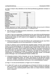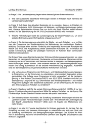 Landtag Brandenburg Drucksache 6/10641 zu Frage 2: Der Landesregierung liegen keine diesbezüglichen Erkenntnisse vor. 3. Wie viele zusätzliche bezahlbare Wohnungen werden in Potsdam nach Kenntnis der Landesregierung benötigt? zu Frage 3: Auf Basis des aktuellen Bestandes ist zu erwarten, dass es in Potsdam im Jahr 2025 mindestens 3.400 Wohnungen mit Mietpreis- und Belegungsbindungen geben wird. Genaue Bedarfszahlen können hier nur durch die Stadt Potsdam selbst benannt werden. Auf die Beantwortung der KA 3763 (Drucksache 6/9425) wird verwiesen. 4. Welche Hilfestellungen bietet die Landesregierung der Stadt Potsdam an, um einer sozialen Entmischung der Wohngebiete entgegenzuwirken? zu Frage 4: Die Landesregierung unterstützt die Städte - so auch Potsdam - u.a. im Rah- men der Programme der Stadtentwicklung bei Maßnahmen der nachhaltigen Stadtent- wicklung. Grundlage einer solchen Förderung sind regelmäßig kommunale Konzepte wie INSEK und WUS. Die Ausgestaltung dieser planerischen Konzepte z.B. im Hinblick auf soziale Entmischung obliegt der jeweiligen Kommune im Rahmen ihrer kommunalen Selbstverwaltungshoheit. Der Entwurf des neuen Brandenburgischen Wohnraumförderungsgesetzes sieht vor, dass Menschen mit niedrigem Einkommen, Studierende und Auszubildende, Menschen mit Be- hinderung und auch Seniorinnen und Senioren leichter in mietpreis- und belegungsgebun- dene Wohnungen ziehen können. Unter anderem werden die Einkommensgrenzen ange- hoben und künftig automatisch an die aktuelle Preisentwicklung angepasst. Außerdem wird der Berechtigtenkreis um gemeinschaftliche Wohnformen erweitert. 5. „Die vorhandenen Programme der Wohnraum- und Städtebauförderung sind geeigne- te Programme, um die Kommunen zu unterstützen, einer sozialen Segregation entge- genzuwirken. Die Auflage neuer Programme ist nicht vorgesehen“, so die Landesre- gierung in ihrer Antwort Drucksache 6/9273 vom 30.07.2018. Inwiefern wird die Lan- desregierung - aufgrund der o.g. Erkenntnisse des Ministerpräsidenten - nun weitere Programme auflegen oder bestehende aufstocken, um die Unterstützung für den sozi- alen Wohnungsbau in Potsdam zu verstärken? zu Frage 5: Das Land stellt für die soziale Wohnraumförderung jährlich 100 Mio. € zur Ver- fügung. Es stehen also damit ausreichend Mittel für weitere Vorhaben zur Verfügung. Die Förderanträge für den Standort Potsdam wurden alle positiv beschieden. 6. Der Ministerpräsident hat erklärt, die Schaffung bezahlbarer Wohnungen sei eine der „größten sozialen Herausforderungen unserer Zeit“. Wie definiert die Landesregierung den Begriff „bezahlbares Wohnen“? (Bitte auch mit Angabe des Mietpreises/ qm, netto/ brutto) zu Frage 6: Im Jahr 2017 wurde das Bündnis für Wohnen gegründet. Es hat das Ziel, die Schaffung von mehr und besseren Wohnungen zu unterstützen und soll zum Erhalt und zur Schaffung von Mietpreis- und Belegungsbindungen beitragen. Das Bündnis für Woh- nen in Brandenburg hat eine einvernehmliche Definition des Begriffs „Bezahlbarkeit des Wohnen“ aufgestellt. -2-