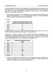 Landtag Brandenburg Drucksache 6/10641 6. Wahlperiode Antwort der Landesregierung auf die Kleine Anfrage Nr. 4194 des Abgeordneten Steeven Bretz (CDU-Fraktion) Drucksache 6/10342 Sozialer Wohnraum in der Landeshauptstadt Potsdam Namens der Landesregierung beantwortet die Ministerin für Infrastruktur und Landespla- nung die Kleine Anfrage wie folgt: Vorbemerkung des Fragestellers: Ministerpräsident Woidke hat angekündigt, dass das Land alles unternehmen werde, „um Ungleichgewichte auf dem Wohnungsmarkt auszu- gleichen“. Weiter sagte er: „Sozialen Frieden kann es nur geben, wenn sich die Menschen eine Wohnung leisten können.“ (MOZ vom 21.11.2018, „Land sorgt sich um bezahlbares Wohnen“) In Potsdam wird der Neubau von Wohnraum dringend benötigt. Die Zahl der Baugeneh- migungen ist allerdings gegenüber dem Vorjahr stark gesunken. (PNN vom 9.11.2018, „Deutlich weniger Baugenehmigungen für neue Wohnungen“). Gleichzeitig nimmt die An- zahl der Sozialwohnungen in der Landeshauptstadt stetig ab. (MAZ vom 14.05.2018, „Im- mer weniger Sozialwohnungen in Potsdam“) Nun hat die Landesregierung ein neues Wohnraumförderungsgesetz vorgelegt. Dieses sieht vor, die Einkommensgrenzen für Wohnberechtigungsscheine anzuheben, um den Bezug von bezahlbaren Wohnungen zu erleichtern (MAZ v. 10.1.2019, „Einkommens- schwache im Land sollen preiswerter wohnen“). 1. Wie stellt sich aus Sicht der Landesregierung der Sachstand in Potsdam dar? zu Frage 1: Nach den Angaben der Stadt Potsdam sind seit 2009 insgesamt 3.788 Woh- nungen fertig gestellt worden. Die Landesregierung hat in der Stadt Potsdam zwischen 2011 und 2018 insgesamt 850 Wohnungen im sozialen Wohnungsneubau gefördert, für 75 % dieser Wohnungen wurden Mietpreis- und Belegungsbindungen vereinbart. Von den geförderten Bauvorhaben sind derzeit 403 Wohnungen fertiggestellt, davon wurden für 305 Wohnungen Mietpreis- und Belegungsbindungen begründet. Die Stadt Potsdam hat mitgeteilt, dass die Errichtung von ca. 4.900 Wohnungen (inklusive der bereits oben genannten, derzeitig im Bau befindlichen geförderten Wohnungen im Neubau) mit einer mittleren Bezugsfertigkeit bis 2020 vorgesehen ist. 2. Inwiefern sieht die Landesregierung den „sozialen Frieden“ in der Landeshauptstadt durch die Wohnungsknappheit gefährdet? Eingegangen: 18.02.2019 / Ausgegeben: 25.02.2019