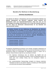 Auftraggeber: Ministerium für Infrastruktur und Landesplanung des Landes Brandenburg (MIL) Auftragnehmer: RegioKontext (projektteam_buendnis@regiokontext.de) Bündnis für Wohnen in Brandenburg Definition Bezahlbarkeit Vom Bündnis für Wohnen in Brandenburg wird eine einvernehmliche Definition des Begriffs „Bezahlbarkeit des Wohnens“ aufgestellt. Hierbei bestimmt sich Bezahlbarkeit relativ zum Haushaltsnettoeinkommen, hängt aber auch von der Dauerhaftigkeit der jeweiligen Wohnsituation und vor allem dem absoluten Betrag ab, der nach Abzug der Wohnkosten (Bruttowarmmiete) für das Bestreiten des Lebensunterhalts verbleibt. Es bestehen Hinweise auf eine Gefährdung der Bezahlbarkeit des Wohnens, wenn dauerhaft mehr als ein Drittel (33 %) des verfügbaren Nettohaushaltseinkommens für die Warmmiete (inkl. warme und kalte Betriebskosten) aufgewendet werden müssen. Von einer mangelnden Bezahlbarkeit des Wohnens ist vor allem dann auszugehen, wenn nach Abzug der Warmmiete nicht ein definierter absoluter Mindestbetrag als monatliches Haushaltsbudget für die Lebensführung verbleibt. Der definierte Mindestbetrag beträgt für einen - 1 Personen-Haushalt: 670 Euro, - 2 Personen-Haushalt: 1.005 Euro, - 3 Personen-Haushalt: 1.234 Euro, - 4 Personen-Haushalt: 1.463 Euro. Der Begriff der „Bezahlbarkeit des Wohnens“ ist ein zentraler, wenngleich unbestimmter und „umkämpfter“ Begriff in der öffentlichen Diskussion. Aus Sicht des Bündnisses für Wohnen in Brandenburg besteht die Notwendigkeit die Begrifflichkeit genauer zu fassen und zu definieren. Dieses Erfordernis ergibt sich aus verschiedenen Gründen: • Eine allgemeine Verständigung über die Definition des Begriffs kann als Ausgangspunkt für die weitergehende Debatte in Politik und Öffentlichkeit dienen. Sie leistet somit einen wichtigen Beitrag dazu die umfangreiche Debatte zu versachlichen. • Eine operationalisierbare Datengrundlage ermöglicht die Messung bestimmter Tatbestände als Basis für die politische Debatte zur Gestaltung der Wohnungspolitik und erhöht damit die politische Steuerungsfähigkeit. Seite 1 von 5