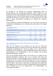 Auftraggeber: Ministerium für Infrastruktur und Landesplanung des Landes Brandenburg (MIL) Auftragnehmer: RegioKontext (projektteam_buendnis@regiokontext.de) Als Grundlage für die Ermittlung des monatlichen Mindestbetrages dienen die Einkommensgrenzen des Wohnraumförderungsgesetzes (WoFG) abzüglich der oben genannten 33 Prozent. Dieser Bezugsrahmen wurde auch deshalb gewählt, weil er einen eindeutigen Bezug zum Thema Wohnkosten aufweist und ganz konkret den Rahmen für eine unterstützende Intervention des Staates definiert. Die Einkommensgrenzen des WoFG dienen in diesem Zusammenhang ausschließlich der Herleitung des monatlichen Mindestbetrages. Für die Ermittlung des monatlichen Mindestbetrages, der nach Abzug der Warmmiete als verbleibendes Haushaltsbudget noch zur Verfügung stehen sollte, ergibt sich die folgende Berechnung: Haushaltsgröße (Personen) 1 2 3 4 WoFG Einkommensgrenze (pro Jahr, netto, Euro) 12.000 18.000 22.100 26.200 Mietbelastungsgrenze (Warmmiete) 33 % 33 % 33 % 33 % Warmmiete (pro Jahr, Euro) 3.960 5.940 7.293 8.646 Restbetrag (pro Jahr, Euro) 8.040 12.060 14.807 17.554 Mindestbetrag (monatlich, Euro) 670 1.005 1.234 1.463 Tab. 1: Ermittlung des monatlichen absoluten Mindestbetrags nach Haushaltsgrößen Quelle: eigene Darstellung Mithin kann ein Haushalt mit vier Personen auch über mehr als 26.200 Euro Jahreshaushaltseinkommen und dennoch nach Abzug der Warmmiete über ein geringeres verbleibendes Haushaltsbudget als 1.463 Euro verfügen. Auch in diesem Fall, der charakteristisch für die sogenannten „prekären Mittelstandshaushalte“ knapp oberhalb der Bemessungsgrenzen der Transfersysteme ist, wäre von fehlender oder zumindest gefährdeter Bezahlbarkeit zu sprechen. Wenn die oben getroffene Definition erfüllt ist, wird zunächst nur von „Hinweis auf eine gefährdete Bezahlbarkeit“ gesprochen, denn es ist zu bedenken, dass hiervon zwei relevante Sachverhalte nur bedingt abgedeckt werden: Zum einen sind die individuellen Wohnkosten zum Teil auch durch individuelles Verhalten bestimmt, etwa im Hinblick auf Heizgewohnheiten. Zum anderen kann sich diese Definition nur auf eine angemessene Wohnung beziehen. Dieser Ansatz zur Betrachtung von Bezahlbarkeit setzt angemessene Wohnungsgrößen voraus. Daher ist der Diskurs um Bezahlbarkeit des Wohnens jenseits der reinen Kostenfrage auch über die Angemessenheit und Verhältnismäßigkeit von Wohnsituationen fortzuführen. Seite 4 von 5