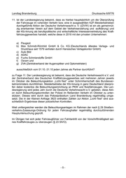 Landtag Brandenburg Drucksache 6/9776 11. Ist der Landesregierung bekannt, dass es hierbei hauptsächlich um die Überprüfung der Fahrzeuge im ruhenden Verkehr bzw. eine in ausgewählten KZF-Meisterbetrieben durchgeführte Aktion der Deutsche Verkehrswacht e. V. ((DVW) ist ein als gemeinnüt- zig anerkannter Verein auf dem Gebiet der Verkehrserziehung und -aufklärung) und der Kfz-Innung als berufspolitische und wirtschaftliche Interessenvertretung des Kraft- fahrzeuggewerbes handelt, welche diese in 2018 mit den privaten Unternehmen: a) Peugeot b) Max Schmidt-Römhild GmbH & Co. KG (Deutschlands ältestes Verlags- und Druckhaus seit 1579 vertreten durch Hansisches Verlagskontor GmbH) c) Auto Bild d) ADAC e) Fuchs Schmierstoffe GmbH f) Osram und g) ZVA (Zentralverband der Augenoptiker und Optometristen) ausschließlich vom 01.10.-31.10 jeden Jahres als Partner durchführt? zu Frage 11: Der Landesregierung ist bekannt, dass die Deutsche Verkehrswacht e.V. und der Zentralverband des Deutschen Kraftfahrzeuggewerbes seit mehreren Jahren jeweils im Oktober die Beleuchtungsaktion „Licht-Test“ unter Schirmherrschaft des Bundesver- kehrsministers durchführen. Meisterbetriebe der Kfz-Innung in ganz Deutschland überprü- fen dabei kostenlos die Beleuchtungseinrichtung an PKW und Nutzfahrzeugen. Die Lan- desregierung wird jedes Jahr durch die Deutsche Verkehrswacht e.V. gebeten, diese Akti- on durch Beleuchtungskontrollen der Polizei im fließenden Verkehr im Oktober zu unter- stützen. Dieses wird durch das Polizeipräsidium Land Brandenburg regelmäßig umge- setzt. Die in der Kleinen Anfrage 3623 enthalten Zahlen zur Aktion „Licht-Test“ sind aus- schließlich Ergebnisse dieser polizeilichen Kontrollen. Weit umfangreicher werden die Beleuchtungsanlagen im Rahmen der nach § 29 Straßen- verkehrs-Zulassungs-Ordnung für jeden Fahrzeughalter regelmäßig durchzuführenden Hauptuntersuchung geprüft. Im Übrigen hat sich jeder Fahrzeugführer vor Fahrtantritt von der Vorschriftmäßigkeit sei- nes Kraftfahrzeuges zu überzeugen (§ 23 StVO). -5-