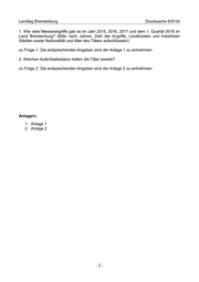 Landtag Brandenburg Drucksache 6/9134 1. Wie viele Messerangriffe gab es im Jahr 2015, 2016, 2017 und dem 1. Quartal 2018 im Land Brandenburg? (Bitte nach Jahren, Zahl der Angriffe, Landkreisen und kreisfreien Städten sowie Nationalität und Alter des Täters aufschlüsseln) zu Frage 1: Die entsprechenden Angaben sind der Anlage 1 zu entnehmen. 2. Welchen Aufenthaltsstatus hatten die Täter jeweils? zu Frage 2: Die entsprechenden Angaben sind der Anlage 2 zu entnehmen. Anlage/n: 1. Anlage 1 2. Anlage 2 -2-