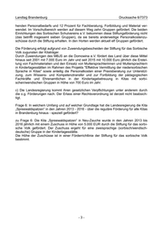 Landtag Brandenburg Drucksache 6/7373 henden Personalbedarfs und 12 Prozent für Fachberatung, Fortbildung und Material ver- wendet. Im Vorschulbereich werden auf diesem Weg zehn Gruppen gefördert. Die beiden Einrichtungen des Sorbischen Schulvereins e.V. bekommen diese Stiftungsförderung nicht (das betrifft insgesamt sieben Gruppen), da sie bereits anderweitige Personalkostenzu- schüsse durch die Stiftung erhalten. In den Horten werden aktuell elf Gruppen gefördert. Die Förderung erfolgt aufgrund von Zuwendungsbescheiden der Stiftung für das Sorbische Volk zugunsten der Kitaträger. Durch Zuwendungen des MBJS an die Domowina e.V. fördert das Land über diese Mittel hinaus seit 2001 mit 7.000 Euro im Jahr und seit 2015 mit 10.000 Euro jährlich die Erstel- lung von Fachmaterialien und den Einsatz von Muttersprachlerinnen und Muttersprachlern in Kindertagesstätten im Rahmen des Projekts "Effektive Vermittlung der niedersorbischen Sprache in Kitas" sowie anteilig die Personalkosten einer Praxisberatung zur Unterstüt- zung, zum Wissens- und Kompetenztransfer und zur Fortbildung der pädagogischen Fachkräfte und Ehrenamtlichen in der Kindertagebetreuung in Kitas mit sorbi- schen/wendischen Gruppen in Höhe von 700 Euro im Jahr. c) Die Landesregierung kommt ihren gesetzlichen Verpflichtungen unter anderem durch die o.g. Förderungen nach. Der Erlass einer Rechtsverordnung ist derzeit nicht beabsich- tigt. Frage 6: In welchem Umfang und auf welcher Grundlage hat die Landesregierung die Kita „Spreewaldspatzen“ in den Jahren 2013 - 2016 - über die reguläre Förderung für alle Kitas in Brandenburg hinaus - speziell gefördert? zu Frage 6: Die Kita „Spreewaldspatzen“ in Neu-Zauche wurde in den Jahren 2013 bis 2016 jährlich mit einem Zuschuss in Höhe von 5.000 EUR durch die Stiftung für das sorbi- sche Volk gefördert. Der Zuschuss ergeht für eine zweisprachige (sorbisch/wendisch- deutsche) Gruppe in der Kindertagesstätte. Die Höhe der Zuschüsse ist in einer Förderrichtlinie der Stiftung für das sorbische Volk bestimmt. -3-