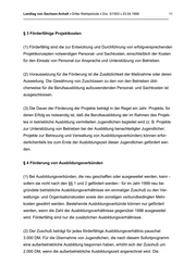 Landtag von Sachsen-Anhalt • Dritte Wahlperiode • Drs. 3/1503 • 23.04.1999 11 _______________________________________________________________________________ § 3 Förderfähige Projektkosten (1) Förderfähig sind die zur Entwicklung und Durchführung von erfolgversprechenden Projektkonzepten notwendigen Personal- und Sachkosten, einschließlich der Kosten für den Einsatz von Personal zur Ansprache und Unterstützung von Betrieben. (2) Voraussetzung für die Förderung ist die Zusätzlichkeit der Maßnahme oder deren Ausweitung. Die Gewährung von Zuschüssen zu den von den Betrieben übli- cherweise für die Berufsausbildung aufzuwendenden Personal- und Sachkosten ist ausgeschlossen. (3) Die Dauer der Förderung der Projekte beträgt in der Regel ein Jahr. Projekte, für deren Erfolg es notwendig ist, daß die Berufsausbildung der im Rahmen des Projek- tes in betriebliche Ausbildung vermittelten Jugendlichen begleitet wird (z. B. Projekte zur Unterstützung von Betrieben bei der Ausbildung benachteiligter Jugendlicher; Projekte zur Betreuung und Verwaltung von Ausbildungsverbünden) können erfor- derlichenfalls bis zum Ende der Ausbildungszeit dieser Jugendlichen gefördert wer- den. § 4 Förderung von Ausbildungsverbünden (1) Bei Ausbildungsverbünden, die neu geschaffen oder ausgeweitet werden, kann - sofern sie nicht nach den §§ 1 und 2 gefördert werden - für im Jahr 1999 neu be- gründete betriebliche Ausbildungsverhältnisse ein einmaliger Zuschuß zu den Ver- waltungs- und Organisationskosten sowie den sonstigen verbundbedingten Mehr- kosten gewährt werden. Bestehende Ausbildungsverbünde können nur gefördert werden, wenn die ZahI der Ausbildungsverhältnisse gegenüber 1998 ausgeweitet wird. Förderfähig sind nur die zusätzlichen Ausbildungsverhältnisse. (2) Der Zuschuß beträgt für jedes förderfähige Ausbildungsverhältnis pauschaI 3.000 DM. Für die Übernahme von Jugendlichen, die nach diesem Sofortprogramm eine außerbetriebIiche Ausbildung begonnen haben, erhöht sich der Zuschuß um 2.000 DM, wenn die außerbetriebIiche Ausbildungszeit angerechnet wird. Die