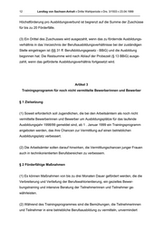 12 Landtag von Sachsen-Anhalt • Dritte Wahlperiode • Drs. 3/1503 • 23.04.1999 _______________________________________________________________________________ Höchstförderung pro Ausbildungsverbund ist begrenzt auf die Summe der Zuschüsse für bis zu 20 Förderfälle. (3) Ein Drittel des Zuschusses wird ausgezahlt, wenn das zu fördernde Ausbildungs- verhältnis in das Verzeichnis der Berufsausbildungsverhältnisse bei der zuständigen Stelle eingetragen ist (§§ 31 ff. Berufsbildungsgesetz - BBiG) und die Ausbildung begonnen hat. Die Restsumme wird nach AbIauf der Probezeit (§ 13 BBiG) ausge- zahlt, wenn das geförderte Ausbildungsverhältnis fortgesetzt wird. Artikel 3 Trainingsprogramm für noch nicht vermittelte Bewerberinnen und Bewerber § 1 Zielsetzung (1) Soweit erforderlich soll Jugendlichen, die bei den Arbeitsämtern als noch nicht vermittelte Bewerberinnen und Bewerber um Ausbildungsplätze für das laufende Ausbildungsjahr 1998/99 gemeldet sind, ab 1 . Januar 1999 ein Trainingsprogramm angeboten werden, das ihre Chancen zur Vermittlung auf einen betrieblichen Ausbildungsplatz verbessert. (2) Die Arbeitsämter sollen darauf hinwirken, die Vermittlungschancen junger Frauen auch in technikorientierten Berufsbereichen zu verbessern. § 2 Förderfähige Maßnahmen (1) Es können Maßnahmen von bis zu drei Monaten Dauer gefördert werden, die die Verbreiterung und Vertiefung der Berufswahlorientierung, ein gezieltes Bewer- bungstraining und intensive Beratung der Teilnehmerinnen und Teilnehmer ge- währleisten. (2) Während des Trainingsprogrammes sind die Bemühungen, die Teilnehmerinnen und Teilnehmer in eine betriebliche Berufsausbildung zu vermitteln, unvermindert