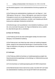 14 Landtag von Sachsen-Anhalt • Dritte Wahlperiode • Drs. 3/1503 • 23.04.1999 _______________________________________________________________________________ dem Berufsbildungsgesetz in einer außerbetrieblichen Einrichtung angeboten wer- den. (2) Die Förderung der außerbetrieblichen Ausbildung soll in der Regel am 1. April 1999 beginnen. Sie kann ab 1. Februar 1999 beginnen, wenn dadurch ein früherer Prüfungstermin erreicht wird und alle Möglichkeiten, den Bewerberinnen und Be- werbern in eine betriebliche Ausbildung zu vermitteln, nach Feststellung der Berufs- beratung des zuständigen Arbeitsamtes erschöpft sind. (3) Die Bemühungen, den Auszubildenden in eine betriebliche Ausbildung zu vermit- teln, sind unvermindert fortzusetzen. Die Träger der Maßnahmen sind zu verpfIich- ten, diese Bemühungen aktiv zu unterstützen. § 2 Dauer der Förderung (1) Die Förderung wird für das erste Ausbildungsjahr bewilligt. Sie endet mit dem Übergang in eine betriebliche Ausbildung. (2) Die Förderung kann nach Ablauf des ersten Jahres der Ausbildung fortgesetzt werden, solange es trotz andauernder Bemühungen im Zusammenwirken mit dem Träger der Maßnahme nicht gelingt, den Auszubildenden in eine betriebliche Ausbil- dung zu vermitteln. § 3 Leistungen (1) Die Förderung umfaßt die Zuschüsse zur Ausbildungsvergütung zuzüglich des Gesamtsozialversicherungsbeitrages und des Beitrags zur Unfallversicherung sowie die Maßnahmekosten. (2) Für die Zuschüsse zur Ausbildungsvergütung gilt § 244 SGB lll entsprechend. (3) Die Maßnahmekosten können übernommen werden. Sie dürfen 80 % der Kosten der außerbetrieblichen Ausbildung nach den §§ 240 ff SGB lll nicht überschreiten.