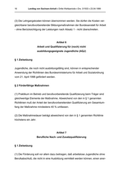 16 Landtag von Sachsen-Anhalt • Dritte Wahlperiode • Drs. 3/1503 • 23.04.1999 _______________________________________________________________________________ (3) Die Lehrgangskosten können übernommen werden. Sie dürfen die Kosten ver- gleichbarer berufsvorbereitender Bildungsmaßnahmen der Bundesanstalt für Arbeit - ohne Berücksichtigung der Leistungen nach Absatz 1 - nicht überschreiten. Artikel 6 Arbeit und Qualifizierung für (noch) nicht ausbildungsgeeignete Jugendliche (AQJ) § 1 Zielsetzung Jugendliche, die noch nicht ausbildungsfähig sind, können in entsprechender Anwendung der Richtlinien des Bundesministeriums für Arbeit und Sozialordnung vom 21. April 1998 gefördert werden. § 2 Förderfähige Maßnahmen (1) Praktikum im Betrieb und berufsvorbereitende Qualifizierung beim Träger sind gleichwertige Elemente der Maßnahme. Abweichend von den in § 1 genannten Richtlinien muß der Anteil der berufsvorbereitenden Qualifizierung am Gesamtum- fang der Maßnahme mindestens 40 % umfassen. (2) Die Maßnahmedauer beträgt abweichend von den in § 1 genannten Richtlinie höchstens ein Jahr. Artikel 7 Berufliche Nach- und Zusatzqualifizierung § 1 Zielsetzung (1) Die Förderung soll vor allem dazu beitragen, daß arbeitslose Jugendliche ohne Berufsabschluß, die nicht in eine Ausbildung vermittelt werden können, einen aner-