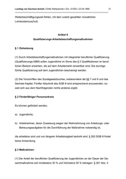 Landtag von Sachsen-Anhalt • Dritte Wahlperiode • Drs. 3/1503 • 23.04.1999 21 _______________________________________________________________________________ Weiterbeschäftigungszeit fehlen, mit dem zuletzt gezahlten monatlichen Lohnkostenzuschuß. Artikel 9 Qualifizierungs-Arbeitsbeschaffungsmaßnahmen § 1 Zielsetzung (1) Durch Arbeitsbeschaffungsmaßnahmen mit integrierter beruflicher Qualifizierung (Qualifizierungs-ABM) sollen Jugendliche im Sinne des § 2 Qualifikationen im beruf- lichen Bereich erwerben, die auf dem Arbeitsmarkt verwertbar sind. Die durchge- führte Qualifizierung soll dem Jugendlichen bescheinigt werden. (2) Die Vorschriften des Sozialgesetzbuches, insbesondere die §§ 7 und 8 und das Sechste Kapitel, Fünfter Abschnitt des SGB lll sind entsprechend anzuwenden, so- weit sich aus dem Nachfolgenden nichts anderes ergibt. § 2 Förderfähiger Personenkreis Es können gefördert werden, a) Jugendliche, b) Arbeitnehmer, deren Zuweisung wegen der Wahrnehmung von Anleitungs- oder Betreuungsaufgaben für die Durchführung der Maßnahme notwendig ist, die arbeitslos sind und von längerer Arbeitslosigkeit bedroht sind. § 263 SGB lll findet keine Anwendung. § 3 Maßnahmen (1) Der Anteil der beruflichen Qualifizierung der Jugendlichen an der Dauer der Ge- samtmaßnahme soll mindestens 30 % und höchstens 50 % betragen. § 261 Abs. 4