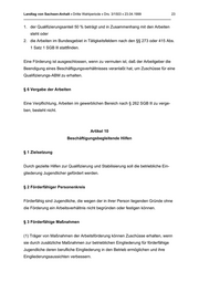 Landtag von Sachsen-Anhalt • Dritte Wahlperiode • Drs. 3/1503 • 23.04.1999 23 _______________________________________________________________________________ 1. der Qualifizierungsanteil 50 % beträgt und in Zusammenhang mit den Arbeiten steht oder 2. die Arbeiten im Bundesgebiet in Tätigkeitsfeldern nach den §§ 273 oder 415 Abs. 1 Satz 1 SGB lll stattfinden. Eine Förderung ist ausgeschlossen, wenn zu vermuten ist, daß der Arbeitgeber die Beendigung eines Beschäftigungsverhältnisses veranlaßt hat, um Zuschüsse für eine Qualifizierungs-ABM zu erhalten. § 6 Vergabe der Arbeiten Eine Verpflichtung, Arbeiten im gewerblichen Bereich nach § 262 SGB lll zu verge- ben, besteht nicht. Artikel 10 Beschäftigungsbegleitende Hilfen § 1 Zielsetzung Durch gezielte Hilfen zur Qualifizierung und Stabilisierung soll die betriebliche Ein- gliederung Jugendlicher gefördert werden. § 2 Förderfähiger Personenkreis Förderfähig sind Jugendliche, die wegen der in ihrer Person liegenden Gründe ohne die Förderung ein Arbeitsverhältnis nicht begründen oder festigen können. § 3 Förderfähige Maßnahmen (1) Träger von Maßnahmen der Arbeitsförderung können Zuschüsse erhalten, wenn sie durch zusätzliche Maßnahmen zur betrieblichen Eingliederung für förderfähige Jugendliche deren berufliche Eingliederung in den Betrieb ermöglichen und ihre Eingliederungsaussichten verbessern.