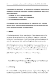 24 Landtag von Sachsen-Anhalt • Dritte Wahlperiode • Drs. 3/1503 • 23.04.1999 _______________________________________________________________________________ (2) Förderfähig sind Maßnahmen, die die betriebliche Eingliederung unterstützen und über betriebsübliche lnhalte hinausgehen (beschäftigungsbegleitende Hilfen). Hierzu gehören Maßnahmen 1. zum Abbau von Sprach- und Bildungsdefiziten, 2. zur Förderung der Fachpraxis und Fachtheorie und 3. zur sozialpädagogischen Begleitung. (3) Arbeitgeber können für die Beschäftigung von Jugendlichen durch Zuschüsse gefördert werden, soweit beschäftigungsbegleitende Hilfen nach diesem Sofortpro- gramm während der Arbeitszeit durchgeführt werden. § 4 Leistung (1) Als Maßnahmekosten können gegenüber dem Träger die angemessenen Auf- wendungen für das zur Durchführung der Maßnahme eingesetzte erforderliche Fachpersonal sowie das insoweit erforderliche Leitungs- und Verwaltungspersonal sowie die angemessenen Sach- und Verwaltungskosten übernommen werden. (2) An Arbeitgeber können in den Fällen des § 3 Abs. 3 Zuschüsse in Höhe des Be- trages erbracht werden, der sich als anteilige Vergütung einschließlich des darauf entfallenden Arbeitgeberanteils am Gesamtsozialversicherungsbeitrag errechnet. (3) Die Förderung darf eine Dauer von 6 Monaten nicht übersteigen. Artikel 11 Soziale Betreuung zur Hinführung an Beschäftigungs- und Qualifizierungs- maßnahmen § 1 Zielsetzung Die Bundesanstalt für Arbeit gewährt Zuschüsse an Träger von Beschäftigungs- und Qualifizierungsprojekten für Jugendliche, die nicht beschäftigt und in keiner Ausbil-