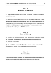 Landtag von Sachsen-Anhalt • Dritte Wahlperiode • Drs. 3/1503 • 23.04.1999 27 _______________________________________________________________________________ Artikel 12 Kombination von Maßnahmen (1) Verschiedene Leistungen können, soweit sinnvoll oder erforderlich, miteinander kombiniert werden. (2) Die Praxisphasen von Maßnahmen nach den Artikeln 6, 7 und 8 können auch im angrenzenden Ausland durchgeführt werden, wenn der Jugendliche von seinem im Inland liegenden Wohnsitz aus täglich die Arbeitsstätte erreicht. lm übrigen gilt § 62 Abs. 2 Nr. 4 SGB lll entsprechend. Die notwendigen Fahrkosten werden in ent- sprechender Anwendung des § 67 SGB lll erstattet. Artikel 13 Dauer der Förderung (1) Soweit bei den einzelnen Leistungen nichts Abweichendes bestimmt ist, beträgt die Förderdauer grundsätzlich ein Jahr. Eintritte in Maßnahmen sind bis zum 31. Dezember 1999 möglich. (2) Für die Mittel des Europäischen Sozialfonds können rechtlich verbindliche Ver- pflichtungen nur bis zum 31. Dezember 1999 eingegangen werden. Artikel 14 Programme Dritter Leistungen nach diesem Programm sind nachrangig gegenüber vergleichbaren Lei- stungen Dritter, insbesondere gegenüber Sonderprogrammen der Länder.