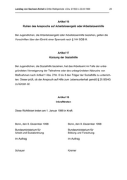 Landtag von Sachsen-Anhalt • Dritte Wahlperiode • Drs. 3/1503 • 23.04.1999 29 _______________________________________________________________________________ Artikel 16 Ruhen des Anspruchs auf Arbeitslosengeld oder Arbeitslosenhilfe Bei Jugendlichen, die Arbeitslosengeld oder Arbeitslosenhilfe beziehen, gelten die Vorschriften über den Eintritt einer Sperrzeit nach § 144 SGB lll. Artikel 17 Kürzung der Sozialhilfe Bei Jugendlichen, die Sozialhilfe beziehen, hat das Arbeitsamt im Falle der unbe- gründeten Verweigerung der Teilnahme oder des unbegründeten Abbruchs von Maßnahmen nach Artikel 1 Abs. 2 Nr. 6 bis 8 den Träger der Sozialhilfe zu unterrich- ten. Dieser prüft, ob der Anspruch auf Hilfe zum Lebensunterhalt gemäß § 25 BSHG zu kürzen ist. Artikel 18 Inkrafttreten Diese Richtlinien treten am 1. Januar 1999 in Kraft. Bonn, den 9. Dezember 1998 Bonn, den 9. Dezember 1998 Bundesministerium für Bundesministerium für Arbeit und Sozialordnung Bildung und Forschung lm Auftrag lm Auftrag Schauer Kremer