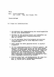 Zu 3. Betr. : Verwa ltungs frage n Drs. l/1133 (Abg. Herr K rause , POS) Kleine Anfrage Wir fragen die Landesregierung: 1. Wie definiert die Landesregierung die Verwaltungshilfen aus den alten Bundesländern? 2. Bestehen für den weiteren Einsatz von Fachkräften aus den alten Bundesländern Schwerpunktbereiche? Wenn ja, welche? 3. Ist ein bestimmter Qualifikationsgrad und praktisch fachliche Kenntnisse für einen möglichen Einsatz vorgeschrieben? 4. Wofür we r den die dafür geplanten Mittel im Haushalt eingesetzt? 5. Ist die Landesregierung davon in Kenntnis gesetzt, daß berufene verantwortliche Leiter aus den alten Bundes ländern, wie Dezernenten, Aatsleiter und Sektorenleiter im öffentlichen Dienst ihr Aat mißbrauchen, indem sie Facharbeiter und Sachbearbeiter für bürotechnische Dienste aus ihrer alten Dienststelle nachziehen und damit Bewerbungen einhei•ischer gleichgelagerter Fach kräfte ungenügend berücksichtigt werden? 6. Erhalten diese Fach- und Sachbearbeiter für ihren Ein satz in Sachsen-Anhalt Aufwandsentschädigungen? Wenn ja, welche und in welcher Höhe.