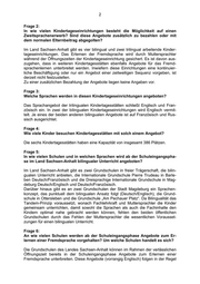 2 Frage 2: In wie vielen Kindertageseinrichtungen besteht die Möglichkeit auf einen Zweitsprachenerwerb? Sind diese Angebote zusätzlich zu bezahlen oder mit dem normalen Elternbeitrag abgegolten? Im Land Sachsen-Anhalt gibt es vier bilingual und zwei trilingual arbeitende Kinder- tageseinrichtungen. Das Erlernen der Fremdsprache wird durch Muttersprachler während der Öffnungszeiten der Kindertageseinrichtung gesichert. Es ist davon aus- zugehen, dass in weiteren Kindertagesstätten ebenfalls Angebote für das Fremd- sprachenlernen unterbreitet werden. Inwiefern diese Einrichtungen eine kontinuier- liche Beschäftigung oder nur ein Angebot einer zeitweiligen Sequenz vorgeben, ist derzeit nicht festzustellen. Zu einer zusätzlichen Bezahlung der Angebote liegen keine Angaben vor. Frage 3: Welche Sprachen werden in diesen Kindertageseinrichtungen angeboten? Das Sprachangebot der trilingualen Kindertagesstätten schließt Englisch und Fran- zösisch ein. In zwei der bilingualen Kindertageseinrichtungen wird Englisch vermit- telt. Je eines der beiden anderen bilingualen Angebote ist auf Französisch und Rus- sisch ausgerichtet. Frage 4: Wie viele Kinder besuchen Kindertagesstätten mit solch einem Angebot? Die sechs Kindertagesstätten haben eine Kapazität von insgesamt 386 Plätzen. Frage 5: In wie vielen Schulen und in welchen Sprachen wird ab der Schuleingangspha- se im Land Sachsen-Anhalt bilingualer Unterricht angeboten? Im Land Sachsen-Anhalt gibt es zwei Grundschulen in freier Trägerschaft, die bilin- gualen Unterricht anbieten, die Internationale Grundschule Pierre Trudeau in Barle- ben Deutsch/Französisch und die Dreisprachige Internationale Grundschule in Mag- deburg Deutsch/Englisch und Deutsch/Französisch. Darüber hinaus gibt es an zwei Grundschulen der Stadt Magdeburg ein Sprachen- konzept, das punktuell dem bilingualen Ansatz folgt (Deutsch/Englisch), die Grund- schule in Ottersleben und die Grundschule „Am Pechauer Platz“. Da Bilingualität das Tandem-Prinzip voraussetzt, wonach Fachlehrkraft und Muttersprachler die Kinder gemeinsam unterrichten, damit sowohl die Sprachen als auch die Fachinhalte den Kindern optimal nahe gebracht werden können, fehlen den beiden öffentlichen Grundschulen durch das Fehlen der Muttersprachler die wesentlichen Vorausset- zungen für einen bilingualen Unterricht. Frage 6: An wie vielen Schulen werden ab der Schuleingangsphase Angebote zum Er- lernen einer Fremdsprache vorgehalten? Um welche Schulen handelt es sich? Die Grundschulen des Landes Sachsen-Anhalt können im Rahmen der verlässlichen Öffnungszeit bereits in der Schuleingangsphase Angebote zum Erlernen einer Fremdsprache unterbreiten. Diese Angebote (vorrangig Englisch) folgen in der Regel