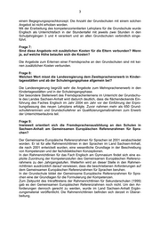 3 einem Begegnungssprachkonzept. Die Anzahl der Grundschulen mit einem solchen Angebot ist nicht erhoben worden. Mit der Erarbeitung des kompetenzorientierten Lehrplans für die Grundschule wurde Englisch als Unterrichtsfach in der Stundentafel mit jeweils zwei Stunden in den Schuljahrgängen 3 und 4 verankert und an allen Grundschulen verbindlich einge- führt. Frage 7: Sind diese Angebote mit zusätzlichen Kosten für die Eltern verbunden? Wenn ja, auf welche Höhe belaufen sich die Kosten? Die Angebote zum Erlernen einer Fremdsprache an den Grundschulen sind mit kei- nen zusätzlichen Kosten verbunden. Frage 8: Welchen Wert misst die Landesregierung dem Zweitsprachenerwerb in Kinder- tagesstätten und ab der Schuleingangsphase allgemein bei? Die Landesregierung begrüßt sehr die Angebote zum Mehrsprachenerwerb in den Kindertagesstätten und in der Schuleingangsphase. Der besondere Stellenwert des Fremdsprachenlernens im Unterricht der Grundschu- le des Landes Sachsen-Anhalt wird dadurch deutlich, dass die flächendeckende Ein- führung des Faches Englisch im Jahr 2004 ein Jahr vor der Einführung der Erpro- bungsfassung des neuen Lehrplans erfolgte. Zuvor nahmen mehr als 650 Grund- schullehrerinnen und Grundschullehrer an Qualifizierungsmaßnahmen zum Erwerb der Unterrichtserlaubnis teil. Frage 9: Inwieweit orientiert sich die Fremdsprachenausbildung an den Schulen in Sachsen-Anhalt am Gemeinsamen Europäischen Referenzrahmen für Spra- chen? Der Gemeinsame Europäische Referenzrahmen für Sprachen ist 2001 verabschiedet worden. Er ist für alle Rahmenrichtlinien in den Sprachen im Land Sachsen-Anhalt, die nach 2001 entwickelt wurden, eine wesentliche Grundlage in der Beschreibung von Kompetenzen und der fachdidaktischen Konzeptionen. In den Rahmenrichtlinien für das Fach Englisch am Gymnasium findet sich eine ex- plizite Zuordnung der Kompetenzstufen des Gemeinsamen Europäischen Referenz- rahmens zu den Jahrgangsstufen. Weiterhin wird an dieser Stelle in den Rahmen- richtlinien ausdrücklich darauf verwiesen, dass die beschriebenen Anforderungen auf dem Gemeinsamen Europäischen Referenzrahmen für Sprachen beruhen. In der Grundschule bildet der Gemeinsame Europäische Referenzrahmen für Spra- chen eine der Grundlagen für die Formulierung der Kompetenzen. Zum Zeitpunkt des Inkrafttretens der Rahmenrichtlinien für Sekundarschulen (1999) gab es den Gemeinsamen Europäischen Referenzrahmen noch nicht. Um den An- forderungen dennoch gerecht zu werden, wurde im Land Sachsen-Anhalt Ergän- zungsmaterial veröffentlicht. Die Rahmenrichtlinien befinden sich derzeit in Überar- beitung.