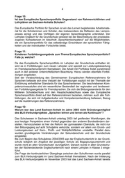 4 Frage 10: Ist das Europäische Sprachenportfolio Gegenstand von Rahmenrichtlinien und Lehrplänen an Sachsen-Anhalts Schulen? Das Europäische Portfolio für Sprachen ist ein das Lernen begleitendes Arbeitsmate- rial für die Schülerinnen und Schüler, das insbesondere die Reflexion des Lernpro- zesses anregt und das Verfolgen der eigenen Sprachbiographie unterstützt. Der Lehrplan Englisch für die Grundschule verweist bei der Beschreibung der prozessbe- zogenen Kompetenzen im Abschnitt „Sprachlernkompetenz“ auf die Möglichkeiten, die ein Sprachenportfolio für das selbständige Einschätzen der sprachlichen Fähig- keiten und der individuellen Fortschritte bietet. Frage 11: Existieren Fortbildungsangebote zum Thema Europäisches Sprachenportfolio? Falls ja, welche? Da das Europäische Sprachenportfolio im Lehrplan der Grundschule enthalten ist, wird es in Fortbildungen zum neuen Lehrplan und speziell zur Leistungsbewertung im Fremdsprachenunterricht thematisiert. Die Arbeit mit Portfolios findet zunehmend auch in den anderen Unterrichtsfächern Beachtung. Hierzu werden ebenfalls Fortbil- dungen angeboten. Seit der Verabschiedung des Gemeinsamen Europäischen Referenzrahmens für Sprachen befasste sich eine Vielzahl der Fortbildungen explizit mit der Thematik der Einführung einheitlicher Standards für das Sprachenlernen. Die beschriebenen Kom- petenzniveaustufen sind ein wesentlicher Bestandteil der regionalen und landeswei- ten Fortbildungsangebote für Fremdsprachen. Da sich die Bildungsstandards für den Mittleren Schulabschluss und den Hauptschulabschluss sowie das Europäische Sprachenportfolio direkt auf den Referenzrahmen beziehen, nehmen auch alle Fort- bildungen, die sich mit Aufgabenkultur und Kompetenzentwicklung befassen, Bezug auf die Ausführungen des Referenzrahmens. Frage 12: Warum war das Land Sachsen-Anhalt im Jahre 2003 nicht Gründungsmitglied des BLK-Verbundprojektes „Sprachen lehren und lernen als Kontinuum“? Das Schulwesen in Sachsen-Anhalt unterlag 2003 tief greifenden Wandlungen, die aus heutiger Perspektive einen Vorlauf gegenüber den anderen Bundesländern dar- stellen. Hervorzuheben ist hier die Reform der gymnasialen Oberstufe, die nicht nur den Bildungsgang auf acht Schuljahre verkürzte, sondern vor allem von Grund- und Leistungskursen auf Kern-, Profil- und Wahlpflichtfächer umstellte. Parallel dazu wurden grundlegende Veränderungen der Sekundarschule und der Grundschule eingeleitet. Bis zum Beginn des Schuljahres 2004/2005 war der Englischunterricht in der Grund- schule lediglich ein Angebot der jeweiligen Schule als Begegnungsunterricht und wurde nicht an allen Grundschulen durchgeführt. Danach wurde in allen Grundschu- len der flächendeckende Englischunterricht nach einem Lehrplan in Klasse 3 einge- führt. Die Frage der kontinuierlichen Übergänge zwischen den Schulformen wurde parallel zum BLK-Verbundprojekt im Land Sachsen-Anhalt thematisiert. Nach der Initiierung des BLK-Verbundprojekts im November 2003 trat das Land Sachsen-Anhalt bereits