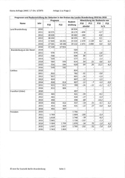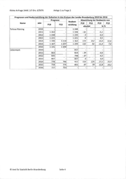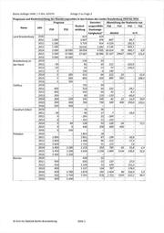 Kleine Anfrage 2448 1 LT-Drs. 6/5976 Anlage 1 zu Frage 2 Prognosen und Realentwicklung der Geburten in den Kreisen des Landes Brandenburg 2010 bis 2016 Prognose Abweichung der Realwerte von Realem- Name Jahr P10 P13 P10 P13 P10 P13 wicklung absolut in Teltow-Flä ming 2010 - - 1 248 - - - - 2011 1 263 - 1 198 - 65 - -5,1 - 2012 1 238 - 1 235 -3 - -0,3 - 2013 1 215 - 1 221 6 ❑,5 - 2014 1 190 1 210 1 362 172 152 14,4 12,6 2015 1 167 1 207 1 299 132 92 11,3 7,6 2016 1 131 1 194 - - - - - Uckermark 2010 - - 837 - - - - 2011 863 - 824 -39 - -4,6 - 2012 835 - 798 - 37 - -4,5 - 2013 807 - 807 ❑ - ❑,0 - 2014 778 786 911 133 125 17,1 15,9 2015 758 776 855 97 79 12,8 10,2 2016 727 763 - - - - - © Amt für Statistik Berlin-Brandenburg Seite 4