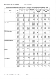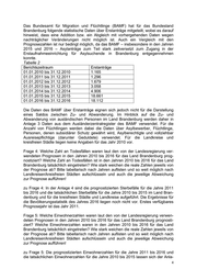 tet, dass mehr Menschen abgewandert sind, als Menschen im selben Zeitraum hin- zugezogen sind. Liegt der Wanderungssaldo bei „null“, sind Zu- und Fortzug ausge- glichen. Über Flüchtlinge lässt die Wanderungsstatistik keine Aussage zu, da ein Merkmal „Flüchtling“ (oder Vergleichbares) rechtlich nicht vorgesehen ist. Nähe- rungsweise hat das Amt für Statistik Berlin-Brandenburg in der Anlage 2 Wande- rungssalden der Personen mit einer Staatsangehörigkeit der zehn stärksten Her- kunftsländer angegeben, die das Bundesamt für Migration und Flüchtlinge in seiner Veröffentlichung „Das Bundesamt in Zahlen 2015-Asyl“, Nürnberg, März 2016, aus- weist (Syrien, Arab. Rep. Albanien, Kosovo, Afghanistan, Irak, Serbien, ungeklärtes Herkunftsland, Eritrea, Mazedonien und Pakistan, zusätzlich für Land Brandenburg Russischen Föderation). Darüber hinaus hat das Bundesamt für Migration und Flüchtlinge (BAMF) für die Jahre 2010 bis 2015 Prognosen über die voraussichtliche Entwicklung der Zugänge von Asylbegehrenden mitgeteilt (gemäß § 44 Absatz 2 Asylgesetz). Für das Jahr 2016 hat das BAMF keine Prognose mitgeteilt. Daher hat sich das Ministerium für Arbeit, Soziales, Gesundheit, Frauen und Familie mit dem Ministerium des Innern und für Kommunales und dem Ministerium der Finanzen im Juli 2016 auf eine landesweite Zugangseinschätzung asylsuchender Personen für das Jahr 2016 verständigt. Tabelle 1 Mitteilung Prognose Prognose Königsteiner Prognose des BAMF des BAMF Erstantragsteller Schlüssel für Erstantragsteller am für das Jahr bundesweit das Land Brandenburg aufgrund Brandenburg Königsteiner Schlüssel 19.11.2009 2010 31.000 3,15402 rund 980 04.10.2010 36.000 rund 1.140 10.02.2011 2011 nicht unter der Zahl 3,12187 mehr als 1.165 aus dem Jahr 2010 06.07.2011 mindestens 42.000 mindestens 1.310 21.09.2011 mindestens 42.000 mindestens 1.310 21.05.2012 2012 ca. 48.000 3,10452 ca. 1.490 09.08.2012 mehr als 50.000 mehr als 1.550 17.10.2012 67.200 rund 2.100 01.02.2013 2013 nicht unter der Zahl 3,07156 mehr als 1.679 aus dem Jahr 2012 17.04.2013 deutlich mehr als deutlich mehr als die Zahl aus dem 1.679 Jahr 2012 09.07.2013 100.000 rund 3.070 15.10.2013 bis zu 110.000 bis zu rund 3.380 16.01.2014 2014 140.000 3,06367 rund 4.290 28.04.2014 über 140.000 über 4.290 23.05.2014 175.000 rund 5.360 19.09.2014 200.000 rund 6.130 18.02.2015 2015 mindestens 3,08092 mindestens 7.700 250.000 07.05.2015 400.000 rund 12.320 20.08.2015 800.000 rund 24.650 2016 3,06053 bis zu 21.000 asylsuchende Personen