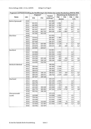 Kleine Anfrage 2448 1 LT-Drs. 6/5976 Anlage 5 zu Frage 5 Prognosen und Realentwicklung der Bevölkerung in den Kreisen des Landes Brandenburg 2010 bis 2016 Prognose* Abweichung der Realwerte von Realent Name Jahr P10 P13 P10 P13 P10 P13 wickIung** absolut in % Oder-Spree 2010 183 859 - - - 2011 182 733 177 764 - 4 969 - -2,7 - 2012 181 636 177 047 - 4 589 - -2,5 - 2013 180 471 176 850 - 3 621 - -2,0 - 2014 179 341 177 901 177 823 -1 518 - 78 -0,8 0,0 2015 178 150 178 064 182 397 4 247 4 333 2,4 2,4 2016 176 992 177 907 - - - - Ostprignitz-Ruppin 2010 102 868 - - - - 2011 102 016 99 753 - 2 263 - -2,2 - 2012 101 127 99 125 - 2 002 - -2,0 - 2013 100 201 98 944 -1 257 - -1,3 - 2014 99 343 98 911 98 886 - 457 - 25 -0,5 0,0 2015 98 450 98 769 99 110 660 341 0,7 0,3 2016 97 620 98 439 - - - - Potsdam-Mittelmark 2010 205 070 - - - - 2011 205 320 203 391 - 1 929 - -0,9 - 2012 205 505 204 388 -1 117 - -0,5 - 2013 205 524 205 520 - 4 0,0 - 2014 205 486 207 253 207 498 2 012 245 1,0 0,1 2015 205 390 208 210 210 910 5 520 2 700 2,7 1,3 2016 205 225 209 143 - - - Prignitz 2010 82 023 - - - - 2011 80 963 79 574 -1 389 - -1,7 - 2012 79 933 78 799 -1 134 - -1,4 - 2013 78 887 77 993 - 894 - -1,1 - 2014 77 824 77 600 77 550 - 274 - 50 -0,4 -0,1 2015 76 793 77 061 77 573 780 512 1,0 0,7 2016 75 749 76 501 - - - - Spree-Neiße 2010 126 400 - - - - 2011 124 400 121 571 - 2 829 - -2,3 - 2012 122 564 120 178 - 2 386 - -1,9 - 2013 120 792 118 899 - 1 893 - -1,6 - 2014 118 988 117 876 118 030 - 958 154 -0,8 0,1 2015 117 201 116 990 117 635 434 645 0,4 0,6 2016 115 429 116 005 - - - - Teltow-Fläming 2010 161 386 - - - - 2011 161 092 159 511 -1 581 - -1,0 - 2012 160 912 159 686 -1 226 - -0,8 - 2013 160 698 160 448 - 250 - -0,2 - 2014 160 504 161 317 161 488 984 171 0,6 0,1 2015 160 074 161 885 163 553 3 479 1 668 2,2 1,0 2016 159 596 163 146 - - - - 0 Amt für Statistik Berlin-Brandenburg Seite 3