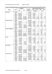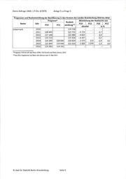 Kleine Anfrage 2448 1 LT-Drs. 6/5976 Anlage 5 zu Frage 5 Prognosen und Realentwicktung der Bevölkerung in den Kreisen des Landes Brandenburg 2010 bis 2016 Prognose* Abweichung der Realwerte von Realent- Name Jahr P10 P13 P10 P13 P10 P13 wicklung** absolut in % Uckermark 2010 129 738 - - - 2011 128 445 123 731 - 4714 - -3,7 - 2012 127 106 122 484 - 4 622 - -3,6 - 2013 125 723 121 326 - 4 397 - -3,5 - 2014 124 299 120 696 120 829 - 3 470 133 -2,8 0,1 2015 122 840 119 940 121 014 -1 826 1 074 -1,5 0,9 2016 121 383 119 193 - - - - *Prognose P10 beruht auf Basis 1990, P13 beruht auf Basis Zensus 2011 **Ab 2011 Ergebnisse auf Basis des Zensus vom 9. Mai 2011 © Amt für Statistik Berlin-Brandenburg Seite 4