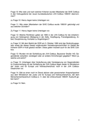 Frage 10: Wie viele und nach welchen Kriterien wurden Mitarbeiter der StVE Cottbus in den Vollzugsdienst der neuen bundesdeutschen JVA Cottbus 1990/91 übernom- men? zu Frage 10: Hierzu liegen keine Unterlagen vor. Frage 11: Wie vielen Mitarbeitern der StVE Cottbus wurde 1990/91 gekündigt und aus welchen Gründen? Zu Frage 11: Hierzu liegen keine Unterlagen vor. Frage 12: Welche Richtlinien galten ab 1990 in der JVA Cottbus für die Unterbrin- gung von Gefangenen (Belegung in der Zelle, Verpflegung, Freizeitgestaltung, Ar- beit, Disziplinierung, Kontakte zu Angehörigen)? zu Frage 12: Mit dem Beitritt der DDR am 3. Oktober 1990 sind das Strafvollzugsge- setz sowie die dieses Gesetz ergänzenden Verwaltungsvorschriften im Gebiet der früheren DDR in Kraft gesetzt worden. Diese galten insoweit auch für die StVE Cott- bus. Frage 13: Wurden mit der Schließung der JVA Cottbus, Bautzener Straße 140, Ge- genstände veräußert, versteigert oder an andere Einrichtungen gegeben? Wenn ja, welche und wohin? zu Frage 13: Unterlagen über Veräußerung oder Versteigerung von Gegenständen im Zusammenhang mit der Schließung der JVA Cottbus liegen weder im Ministerium der Justiz und für Europa und Verbraucherschutz noch in der JVA Cottbus- Dissenchen vor. Frage 14: Gibt es einen noch im Dienst aktiven oder pensionierten Ansprechpartner aus dem Ministerium der Justiz und für Europa und Verbraucherschutz, der dem Menschenrechtszentrum Cottbus e. V. über die Umbruchszeit 1990/91 Auskunft ge- ben kann? zu Frage 14: Nein.