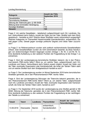 Landtag Brandenburg Drucksache 6/10033 Anzahl der Fälle Kategorie September 2018 Gewaltdelikte 8 Terroristische Straftaten 0 Störung der Totenruhe gem. § 168 StGB 1 Bildung einer kriminellen Vereinigung 0 Sonstige Straftaten 114 Gesamt 123 Frage 2: Um welche Gewalttaten - tabellarisch aufgeschlüsselt nach Ort, Landkreis, Da- tum, Herkunftsland der/s Opfer/s, Anzahl der Opfer und der Täter, Straftat nach dem Straf- gesetzbuch - handelte es sich? Welche dieser Straftaten waren extremistisch ausgeprägt? Welchen Kategorien im Themenfeld Hasskriminalität (fremdenfeindlich, antisemitisch, Ge- walt gegen Linke, Gewalt gegen sonstige politische Gegner) sind diese Taten zuzuord- nen? zu Frage 2: Im Referenzzeitraum wurden acht politisch rechtsmotivierte Gewaltstraftaten erfasst. Zwei Gewaltstraftaten wurden als nicht extremistisch bewertet, da diese Handlun- gen von strafunmündigen Kindern begangen wurden (Anlage 1, lfd. Nr. 2 und lfd. Nr. 4). Eine dezidierte Aufstellung zu den weiteren Punkten der Fragestellung ist der Anlage 1 zu entnehmen. Frage 3: Sind der Landesregierung terroristische Straftaten bekannt, die in den Phäno- men-bereich PMK-rechts fallen? Wenn ja, um welche Taten, aufgeschlüsselt nach Ort, Landkreis und Datum, Herkunftsland der/s Opfer/s soweit möglich, Anzahl der Opfer und der Täter, eventuelle Organisation oder Kameradschaft, die hinter der Tat/den Tätern steht und um welche Straftat nach dem Strafgesetzbuch handelt es sich? zu Frage 3: Der Landesregierung wurden im Monat September 2018 keine terroristischen Straftaten gemeldet, die in den Phänomenbereich PMK -rechts- fallen. Frage 4: Sind der Landesregierung Störungen der Totenruhe bekannt geworden, die in den Phänomenbereich PMK-rechts fallen? Wenn ja, um welche Taten, aufgeschlüsselt nach Ort, Landkreis und Datum, Anzahl der Täter, eventuelle Organisation oder Kamerad- schaft, die hinter der Tat/den Tätern steht, handelt es sich? zu Frage 4: Für September 2018 wurde der Landesregierung eine Straftat gemäß § 168 StGB -Störung der Totenruhe- gemeldet, die in den Phänomenbereich PMK -rechts- fällt. Eine dezidierte Aufstellung zu den weiteren Punkten der Fragestellung ist der nachfolgen- den Tabelle zu entnehmen. Anzahl der ermittelten Tatzeit Tatort Landkreis Themenfelder Tatverdächtigen antisemitisch, 13.09.2018 Eberswalde Barnim fremdenfeindlich 1 -2-