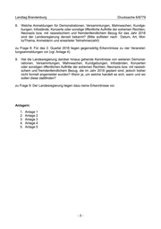 Landtag Brandenburg Drucksache 6/8779 8. Welche Anmeldungen für Demonstrationen, Versammlungen, Mahnwachen, Kundge- bungen, Infostände, Konzerte oder sonstige öffentliche Auftritte der extremen Rechten, Neonazis bzw. mit rassistischem und fremdenfeindlichem Bezug für das Jahr 2018 sind der Landesregierung derzeit bekannt? (Bitte auflisten nach Datum, Art, Mot- to/Thema, Anmelderin und erwarteter Teilnehmerzahl!) zu Frage 8: Für das 2. Quartal 2018 liegen gegenwärtig Erkenntnisse zu vier Veranstal- tungsanmeldungen vor (vgl. Anlage 4). 9. Hat die Landesregierung darüber hinaus gehende Kenntnisse von weiteren Demonst- rationen, Versammlungen, Mahnwachen, Kundgebungen, Infoständen, Konzerten oder sonstigen öffentlichen Auftritte der extremen Rechten, Neonazis bzw. mit rassisti- schem und fremdenfeindlichem Bezug, die im Jahr 2018 geplant sind, jedoch bisher nicht formell angemeldet wurden? Wenn ja, um welche handelt es sich, wann und wo sollen diese stattfinden? zu Frage 9: Der Landesregierung liegen dazu keine Erkenntnisse vor. Anlage/n: 1. Anlage 1 2. Anlage 2 3. Anlage 3 4. Anlage 4 5. Anlage 5 -3-