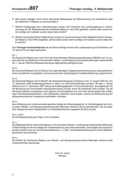 Drucksache 5/ 807 Thüringer Landtag - 5. Wahlperiode 6. Was spricht dagegen, durch einen reduzierten Beitragssatz die Refinanzierung von Investitionen über die Gebühren in Melpers zu berücksichtigen? 7. Welche Festlegungen bzw. Vereinbarungen wurden nach Kenntniss der Landesregierung im Zusam- menhang mit der Mitgliedschaft der Gemeinde Melpers in den KWA getroffen, welche Ziele wurden da- mit verfolgt und inwieweit wurden diese Ziele erreicht? 8. Welche rechtsaufsichtlichen Maßnahmen wurden im Zusammenhang mit der Mitgliedschaft der Gemein- de Melpers in den KWA eingeleitet, welche Ziele wurden damit verfolgt und inwieweit wurden diese Zie- le erreicht? Das Thüringer Innenministerium hat die Kleine Anfrage namens der Landesregierung mit Schreiben vom 19. April 2010 wie folgt beantwortet: Zu 1.: Die Gemeinde Melpers hat in der Form des Eigenbetriebes Melperswasserabwasser (MEWA) vom 10. Au- gust 2002 bis zum Beitritt zum Kommunalen Wasser- und Abwasserzweckverband Meininger Umland (KWA) am 1. Januar 2008 die Abwasserentsorgung eigenständig wahrgenommen. Zu 2.: Die Gemeinde Melpers hat im Zeitraum der eigenständigen Aufgabenwahrnehmung keine abwassertechni- schen Investitionen durchgeführt. Insoweit wurde keine diesbezügliche Investitionsförderung vorgenommen. Zu 3.: Die Gemeinde Melpers hat im Bereich der Abwasserentsorgung im Zeitraum vom 10. August 2002 bis zum 31. Dezember 2005 Einleitungsgebühren in Höhe von 0,46 Euro/Kubikmeter erhoben. Ab dem 1. Januar 2006 bis zum 31. Dezember 2007 betrug die Einleitungsgebühr 4,70 Euro/Kubikmeter. Grundgebühren für die Benutzung der kommunalen Abwassereinrichtung wurden durch die Gemeinde nicht erhoben. Da die Gemeinde Melpers Investitionen nicht geplant und durchgeführt hat, sind nach Kenntnisstand der zustän- digen Rechtsaufsichtsbehörde in den kalkulierten Gebühren keine Anteile, welche die Refinanzierung der abwassertechnischen Investitionen beinhalten, enthalten. Zu 4.: Nach Mitteilung des Landesverwaltungsamtes beträgt die Einleitungsgebühr im Verbandsgebiet des Kom- munalen Wasser- und Abwasserzweckverbandes Meininger Umland 2,46 Euro/Kubikmeter. Die Grundge- bühr beträgt bei einem Wasserzähler 2,5 Kubikmeter/Stunde insgesamt 90,00 Euro/Jahr. Zu 5. und 6.: Auf die Beantwortung der Frage 3 wird verwiesen. Zu 7.: Die Mitgliedschaft der Gemeinde Melpers im Kommunalen Wasser- und Abwasserzweckverband Meininger Umland erfolgt auf der Grundlage der Verbandssatzung des Zweckverbandes. Die Aufgabe des Zweckver- bandes besteht nach der Zweckverbandssatzung u. a. darin, die Abwasserentsorgung für seine Mitglieds- gemeinden durchzuführen. Zu 8.: Der Beitritt der Gemeinde Melpers zum Wasser- und Abwasserzweckverband Meininger Umland wurde rechtsaufsichtlich genehmigt. Prof. Dr. Huber Minister 2