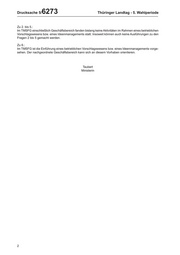 Drucksache 5/ 6273 Thüringer Landtag - 5. Wahlperiode Zu 2. bis 5.: Im TMSFG einschließlich Geschäftsbereich fanden bislang keine Aktivitäten im Rahmen eines betrieblichen Vorschlagswesens bzw. eines Ideenmanagements statt. Insoweit können auch keine Ausführungen zu den Fragen 2 bis 5 gemacht werden. Zu 6.: Im TMSFG ist die Einführung eines betrieblichen Vorschlagswesens bzw. eines Ideenmanagements vorge- sehen. Der nachgeordnete Geschäftsbereich kann sich an diesem Vorhaben orientieren. Taubert Ministerin 2
