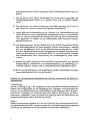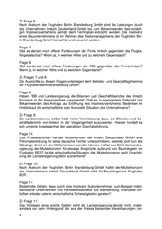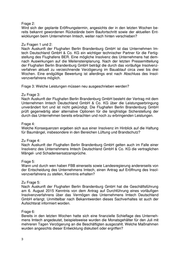 Zu Frage 6: Nach Auskunft der Flughafen Berlin Brandenburg GmbH sind die Leistungen durch das Unternehmen Imtech Deutschland GmbH bis zum Bekanntwerden des vorläufi- gen Insolvenzverfahrens gemäß dem Terminplan erbracht worden. Die Insolvenz eines Bauunternehmens ist im Rahmen des Risikomanagements der Flughafen Ber- lin Brandenburg GmbH betrachtet und bewertet worden. Frage 7: Gibt es derzeit noch offene Forderungen der Firma Imtech gegenüber der Flugha- fengesellschaft? Wenn ja, in welcher Höhe und zu welchem Gegenstand? Frage 8: Gibt es derzeit noch offene Forderungen der FBB gegenüber der Firma Imtech? Wenn ja, in welcher Höhe und zu welchem Gegenstand? Zu Fragen 7 und 8: Die Auskünfte zu diesen Fragen unterliegen dem Betriebs- und Geschäftsgeheimnis der Flughafen Berlin Brandenburg GmbH. Frage 9: Haben FBB und Landesregierung die Bilanzen und Geschäftsberichte des Imtech Konzerns in der Vergangenheit ausgewertet? Gab es zu irgendeinem Zeitpunkt (vor Bekanntwerden des Antrags auf Eröffnung des Insolvenzverfahrens) Bedenken im Hinblick auf die wirtschaftliche oder finanzielle Situation des Unternehmens? Zu Frage 9: Die Landesregierung selbst hatte keine Veranlassung dazu, die Bilanzen und Ge- schäftsberichte von Imtech in der Vergangenheit auszuwerten. Hierbei handelt es sich um eine Angelegenheit der operativen Geschäftsführung. Frage 10: Laut Presseberichten hat der Mutterkonzern der Imtech Deutschland GmbH eine Patronatserklärung für seine deutsche Tochter unterschrieben, weshalb sich nun alle Gläubiger direkt an den Mutterkonzern wenden können. Haftet aus Sicht der Landes- regierung der Mutterkonzern für etwaige Ansprüche aufgrund von Baumängeln am Flughafen BER? Ist die wirtschaftliche Situation des Mutterkonzerns nach Einschät- zung der Landesregierung dafür ausreichend? Zu Frage 10: Nach Auskunft der Flughafen Berlin Brandenburg GmbH haftet der Mutterkonzern des Unternehmens Imtech Deutschland GmbH nicht für Baumängel am Flughafen BER. Frage 11: Besteht die Gefahr, dass durch eine Insolvenz Subunternehmer, zum Beispiel mittel- ständische Unternehmen und Handwerksbetriebe aus Brandenburg, finanzielle Ein- bußen erleiden oder in wirtschaftliche Schwierigkeiten geraten? Zu Frage 11: Das Vorliegen einer solche Gefahr sieht die Landesregierung derzeit nicht, insbe- sondere vor dem Hintergrund der aus der Presse bekannten Vereinbarungen zwi-