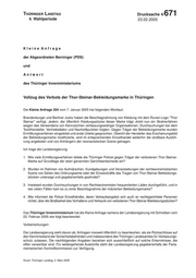 THÜRINGERLandtag Thüringer LANDTAG - 4. Wahlperiode Drucksache 4/ 671 4. Wahlperiode 23.02.2005 Kleine Anfrage der Abgeordneten Berninger (PDS) und Antwort des Thüringer Innenministeriums Vollzug des Verbots der Thor-Steinar-Bekleidungsmarke in Thüringen Die Kleine Anfrage 204 vom 7. Januar 2005 hat folgenden Wortlaut: Brandenburger und Berliner Justiz haben die Beschlagnahmung von Kleidung mit dem Runen-Logo "Thor Steinar" verfügt. Jedem, der öffentlich Kleidungsstücke dieser Marke trägt, droht nun ein Strafverfahren wegen des Verwendens von Kennzeichen verfassungswidriger Organisationen. Durchsuchungen bei dem Textilhersteller, Vertriebsläden und Nazitreffpunkten folgten. Gegen Träger der Bekleidungsmarke wurden Ermittlungsverfahren eingeleitet und erste Urteile gesprochen. Obwohl der Hersteller das Erscheinungsbild der Bekleidungsmarke modifizierte, wird im entsprechenden Einzelhandel weiterhin die strafbare Ausfüh- rung angeboten und von Anhängern der neonazistischen Szene getragen. Ich frage die Landesregierung: 1. Wie viele Ermittlungsverfahren leitete die Thüringer Polizei gegen Träger der verbotenen Thor-Steinar- Marke auf Grundlage der oben genannten Gerichtsentscheide ein? 2. Wurden im Rahmen von Aufmärschen, Kundgebungen und Veranstaltungen der rechtsextremistischen Szene von Seiten des Ordnungsamts oder der Einsatzkräfte das Tragen von Thor-Steinar-Bekleidungs- stücken untersagt und gegebenenfalls geahndet? 3. Inwieweit wurden Durchsuchungen in von Rechtsextremisten frequentierten Läden durchgeführt, und in wie vielen Fällen kam es zu einer Beschlagnahme der indizierten Bekleidungsmarke? 4. Wie informiert die Polizei Einzelhändler, deren Verkaufsangebot sich auch an rechtsgerichtete Personen richtet, über die Strafbarkeit des Vorhaltens und Verkaufs von verbotenen Thor-Steinar-Bekleidungsstücken? Das Thüringer Innenministerium hat die Kleine Anfrage namens der Landesregierung mit Schreiben vom 22. Februar 2005 wie folgt beantwortet: Vorbemerkungen: Die Landesregierung sieht davon ab, Anfragen insoweit öffentlich zu beantworten, als sie Rückschlüsse auf den Kenntnisstand der Sicherheitsbehörden und insbesondere des Thüringer Landesamtes für Verfassungs- schutz zulassen. Die nachfolgenden Angaben beziehen sich ausschließlich auf solche Erkenntnisse, die offen verwertbar sind. Für weitergehende Auskünfte steht die Landesregierung gegebenenfalls der Parla- mentarischen Kontrollkommission zur Verfügung. Druck: Thüringer Landtag, 2. März 2005 1