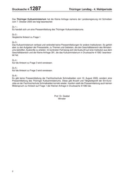 Drucksache 4/ 1287 Thüringer Landtag - 4. Wahlperiode Das Thüringer Kultusministerium hat die Kleine Anfrage namens der Landesregierung mit Schreiben vom 7. Oktober 2005 wie folgt beantwortet: Zu 1.: Es handelt sich um eine Pressemitteilung des Thüringer Kultusministeriums. Zu 2.: Vergleiche Antwort zu Frage 1 Zu 3.: Das Kultusministerium verfasst und verbreitet keine Pressemitteilungen für andere Institutionen. Es gehört aber zu den Aufgaben der Pressestelle, zu Themen und Gebieten, die den Geschäftsbereich des Ministeri- ums betreffen, Auskünfte zu erteilen. Im konkreten Fall bezog sich die Auskunft auf eine Institution aus dem Geschäftsbereich und die Kleine Anfrage 391, die das Kultusministerium in Drucksache 4/1083 beantwor- tet hat. Zu 4.: Auf die Antwort zu Frage 3 wird verwiesen. Zu 5.: Auf die Antwort zu Frage 3 wird verwiesen. Zu 6.: Es gibt keine Pressemitteilung der Fachhochschule Schmalkalden vom 10. August 2005, sondern eine Pressemitteilung des Thüringer Kultusministeriums. Diese gibt Anzahl und Tätigkeitsprofil der Ein-Euro- Jobs an der Fachhochschule Schmalkalden korrekt wieder. Insofern stellt die Pressemitteilung auch keinen Widerspruch zur Antwort auf Frage 1 der Kleinen Anfrage in Drucksache 4/1083 dar. Prof. Dr. Goebel Minister 2