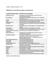Anlage zur Kleinen Anfrage Nr. 3710 Möglichkeit zur Internetkommunikation für Asylsuchende Landkreis/kreisfreie Stadt Öffentliche Internetzugänge Altenburger Land Internetcafè in einer Entfernung von 600 m von der Gemeinschaftsunterkunft Eichsfeldkreis Internetcafè in Leinefelde (Entfernung: 9 km) und Worbis (Entfernung: 4 km) Gotha Internetnutzung in der Gemeinschaftsunterkunft möglich Greiz öffentliche WLAN-Internetzugänge in der Stadt Hildburghausen Internetnutzung in der Gemeinschaftsunterkunft möglich Ilm-Kreis Internetcafès in der Innenstadt und für Kinder in der Schule kostenlos Kyffhäuserkreis keine öffentlichen Internetzugänge in unmittelbarer Nähe nutzbar Nordhausen öffentliche WLAN-Internetzugänge in der Stadt Saale-Holzland- kostenlose Internetnutzung bei Mc Donald`s (eine Stunde), Kreis/Landesaufnahmestelle Internetnutzung im Jugendclub (Wasserturm) Eisenberg Saale-Orla-Kreis Internetcafè in einer Entfernung von 300 m von der Gemeinschaftsunterkunft Saalfeld-Rudolstadt kostenlose Internetnutzung in der Zeit von Montag bis Donnerstag, 13.00 Uhr bis 17.00 Uhr, in der Begegnungsstätte Beulwitz in unmittelbarer Nähe zur Gemeinschaftsunterkunft Schmalkalden-Meiningen keine Gemeinschaftsunterkunft Sömmerda keine Gemeinschaftsunterkunft Sonneberg keine Gemeinschaftsunterkunft Unstrut-Hainich-Kreis keine öffentlichen Internetzugänge vorhanden Wartburgkreis Bibliothek in Gerstungen in einer Entfernung von 3 km zur Gemeinschaftsunterkunft Weimarer Land Internetnutzung in der Gemeinschaftsunterkunft möglich Eisenach Internetcafès in der Stadt Erfurt Internetcafès in der Stadt Gera Internetnutzung in der Gemeinschaftsunterkunft möglich Jena Internetnutzung in der Gemeinschaftsunterkunft möglich Suhl keine Gemeinschaftsunterkunft Weimar Internetnutzung in der Gemeinschaftsunterkunft möglich Quelle: Landesverwaltungsamt