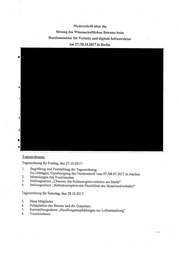 über die Niederschrift Sitzung des Wissenschaftlichen für Verkehr Bundesminister am und 27./28.10.2017 Beirates beim digitale Infrastruktur in Berlin Tagesordnung: Tagesordnungfür l., Freitag, den 27.10.2017: Begrüßungund Feststellung der Tagesordnung; Zu-/Absagen; Genehmigungder Niederschrift vom 07./08.07.2017 in Aachen Mitteilungen des Vorsitzenden Stellungnahme „Chancen des Schienengüterverkehrsam Markt“ Stellungnahme „Hafenkonzeptionmit Flexibilität des Hinterlandverkehrs“ PuD Tagesordnung für Samstag, den 28.10.2017: Neue’ Mitglieder Präsentation onau des Beirats und der Gutachten zur Kurzstellungnahme „Handlungsempfehlungen Luftreinhaltung“ Verschiedenes