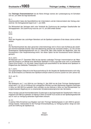 Drucksache 4/ 1003 Thüringer Landtag - 4. Wahlperiode Das Thüringer Finanzministerium hat die Kleine Anfrage namens der Landesregierung mit Schreiben vom 22. Juni 2005 wie folgt beantwortet: Zu 1.: Zwischenzeitlich haben die Geschäftsführer der Untermieterin und der Untervermieterin den Vertrag unter- zeichnet. Die Vertragslaufzeit beginnt am 1. Juni 2005. Die Wirksamkeit des Vertrages steht unter Vorbehalt der Zustimmung der jeweiligen Gesellschafter der Vertragsparteien. Die Zustimmung muss bis zum 15. Juli 2005 erklärt werden. Zu 2.: keine Zu 3.: Nach den Angaben des zukünftigen Betreibers soll die Spielbank spätestens Ende dieses Jahres eröffnet werden. Zu 4.: Die Rechtswirksamkeit des oben genannten Untermietvertrags wird in Kürze nach Aufhebung der jeweili- gen Gremienvorbehalte erwartet. Nach dem Mietvertrag zwischen der Transactio GmbH u. Co. KG und der landeseigenen Spielbankgesellschaft vom 27. Februar/28. März 2002 besteht die Möglichkeit, dass der Konzessionär in den Hauptmietvertrag eintritt. Von dieser Option hat der Konzessionär keinen Gebrauch gemacht. Zu 5. und 6.: Mit Bescheid vom 27. Dezember 2004 hat das damals zuständige Thüringer Innenministerium der West- spiel die Erlaubnis zum Betrieb einer öffentlichen Spielbank in Erfurt zugunsten einer noch zu errichtenden Casino Erfurt GmbH u. Co. KG erteilt. Diese Erlaubnis gilt ausschließlich für den Betrieb einer Spielbank im Erdgeschoss des Gebäudes Theaterplatz 2 in Erfurt. Zu 7. und 8.: Zum gegenwärtigen Zeitpunkt ist die Neuausschreibung für die Vergabe der Spielbankerlaubnis nicht mög- lich, da die Erlaubnis zum Betrieb einer Spielbank wirksam erteilt ist und eine Laufzeit von zehn Jahren hat. Zu 9. und 10.: nein Zu 11.: Seit Mietbeginn am 7. Juni 2004 bis zum Stichtag 31. Mai 2005 hat die Erste Thüringer Spielbankgesell- schaft mbH u. Co. KG zur Erfüllung ihrer vertraglichen Pflichten aus dem Mietvertrag insgesamt Zahlungen in Höhe von 426 295 Euro geleistet. Darin enthalten ist eine Zahlung in Höhe von zwei Monatsmieten zur vergleichsweisen Abgeltung von zu erwartenden Schadenersatzansprüchen des Vermieters. Hierzu hat das Land als Kommanditist bisher Zuzahlungen in das Eigenkapital der Gesellschaft in Höhe von insgesamt 333 398 Euro geleistet. Ein Betrag in Höhe von 92 897 Euro wurde von der Spielbankgesellschaft aus ihr noch zur Verfügung stehenden Eigenmitteln erbracht. Zu 12.: In welcher Höhe Einnahmen aus Abgaben nach dem Thüringer Spielbankgesetz im Jahr 2005 für gemein- nützige Zwecke, insbesondere für die Thüringer Ehrenamtsstiftung, zur Verfügung stehen, hängt vom Zeit- punkt der Eröffnung der Spielbank ab. Diezel Ministerin 2